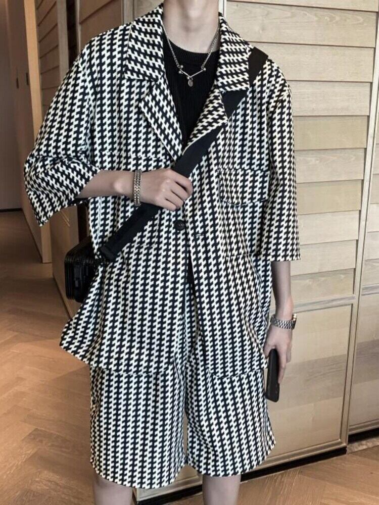 男性スーツ夏ブレザーシャツ + ショーツ 2 ピースハワイシャツブラウス半袖だぶだぶスーツ夏男性布 2pc セット ショート ハーフスリーブ サマー 夏物 ブルマー got68977729908