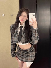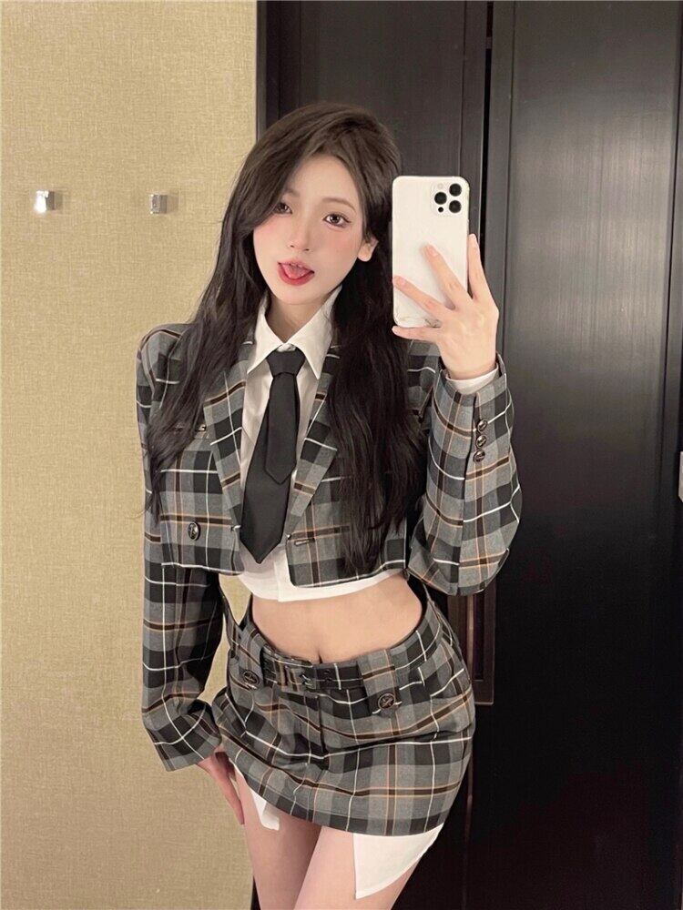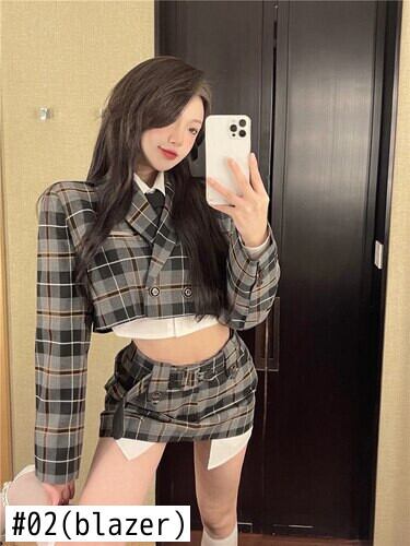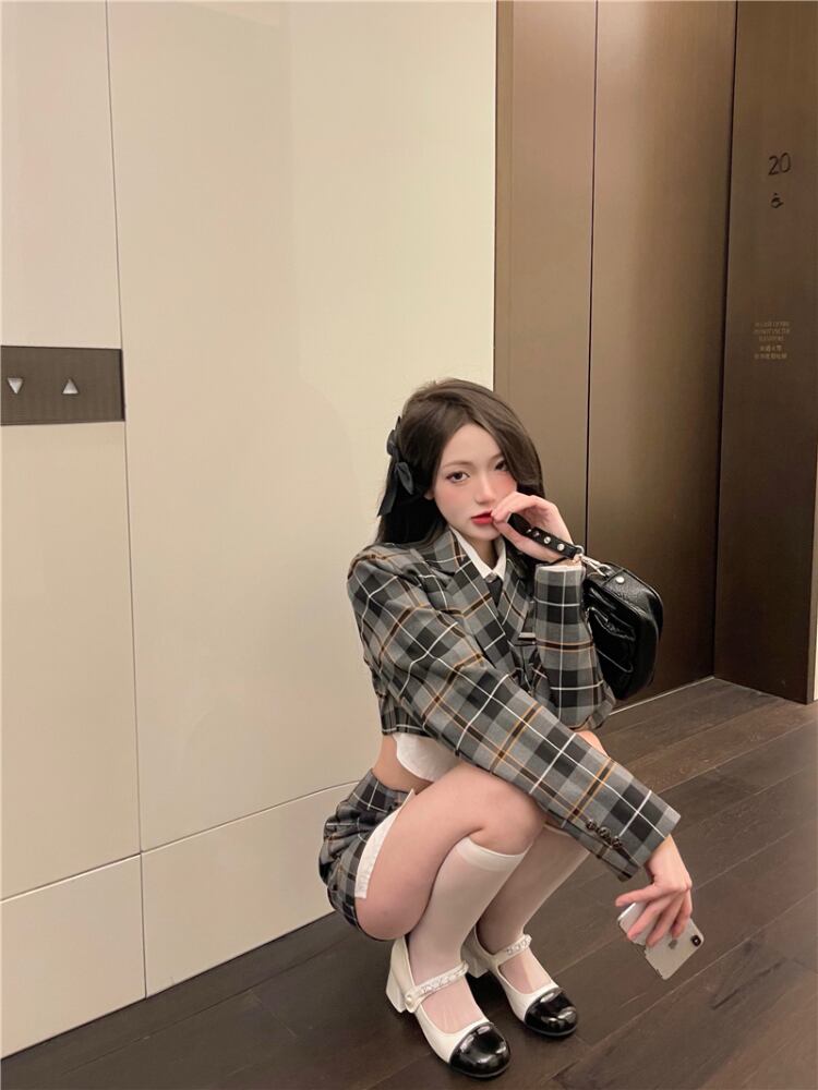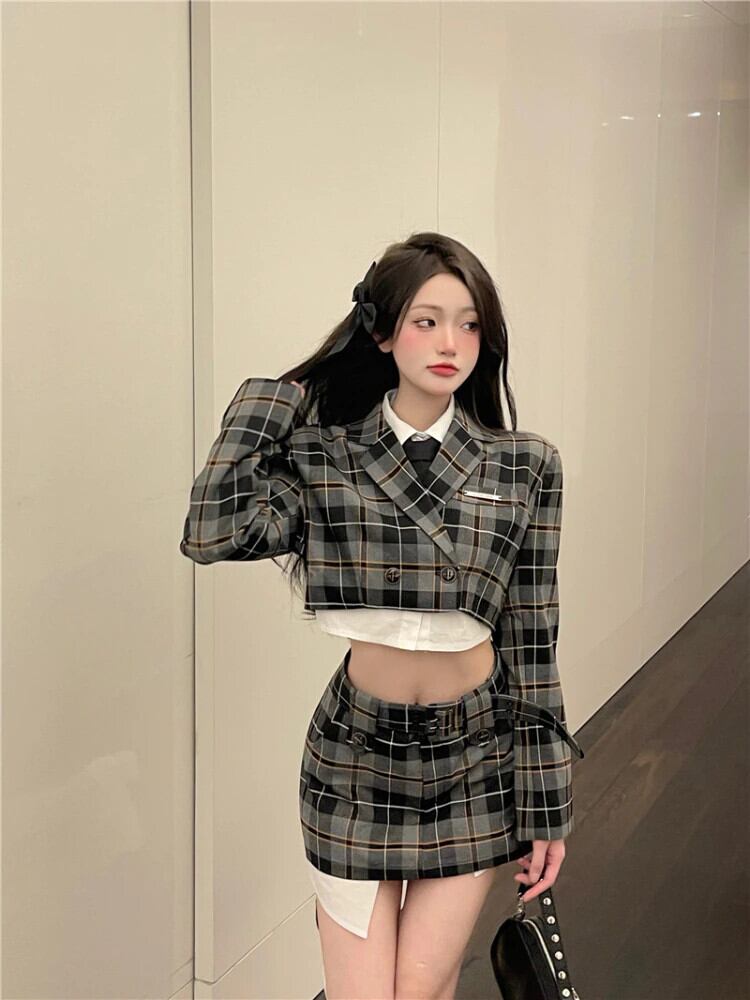 女性スーツチェック柄ブレザークロップ + シャツ + プリーツスカート夏春スキニーセクシーなスカートプレッピースーツ A ラインスカートストリートセット スプリング 春物 サマー 夏物 Aライン got11508986432