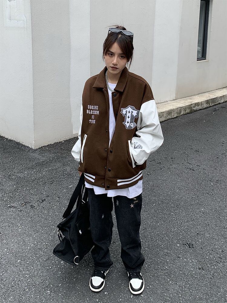 ストリート野球ジャケット女性男性コートステッチ上着レトロ服だぶだぶレディースブラウンボンバージャケットウインドブレーカー got44034199466