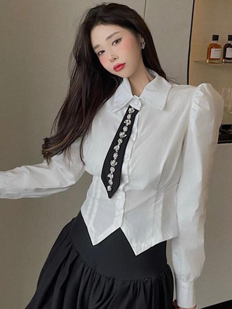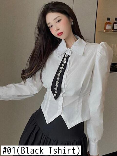 女性スーツ白シャツネクタイ + ミニスカートパフスリーブトップブラウスブラウンプリーツスカートオフィスレディストリート ホワイト 会社 学校 通勤や通学にも got73580651914