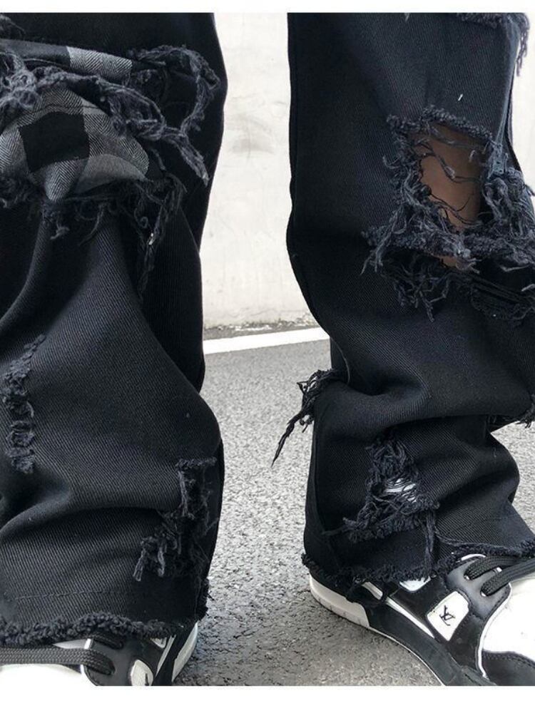 ストリート ジーンズ リップド ブラック ワイドレッグ パンツ ウエスト 原宿 ストレート ズボン バギー メンズ ボトム 春 かわいい スプリング 春物 ワイドパンツ got47293523777