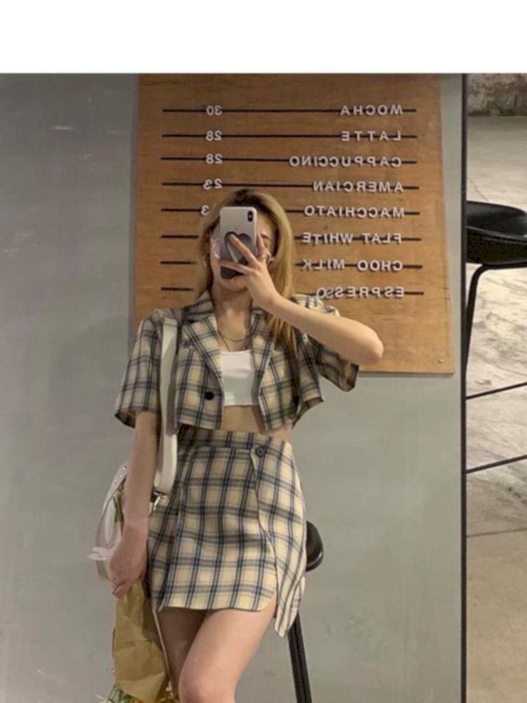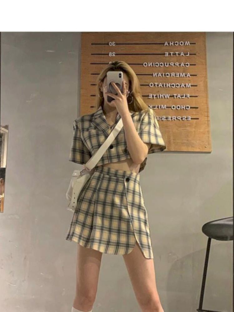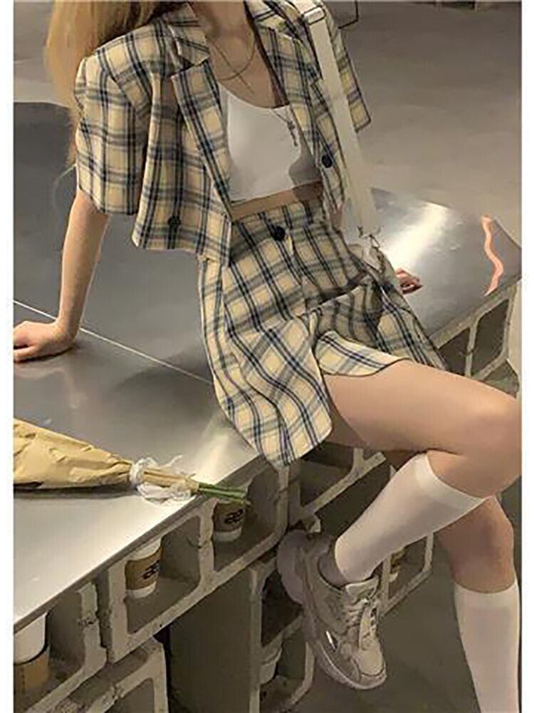 女性スーツチェック柄クロップブレザー + スカート夏 2 ピースセット V ネックイエロープレッピーシック サマー 夏物 Vネック got82001755019