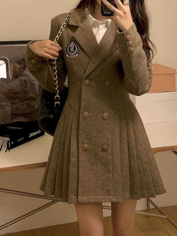 プレッピースタイルの女性ブレザージャケットドレスコーヒー女性トップ V ネックプリーツコートスキニー春秋ウールブレンドオフィスレディ スプリング 春物 オータム 秋物 Vネック 会社 学校 通勤や通学にも got32722607468