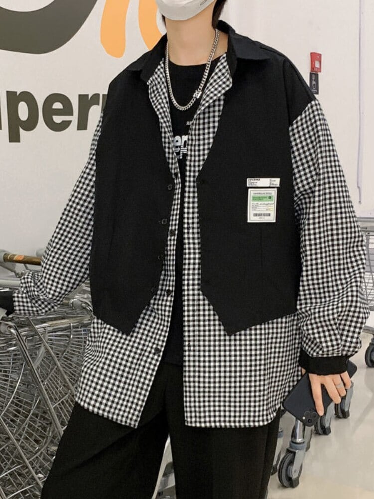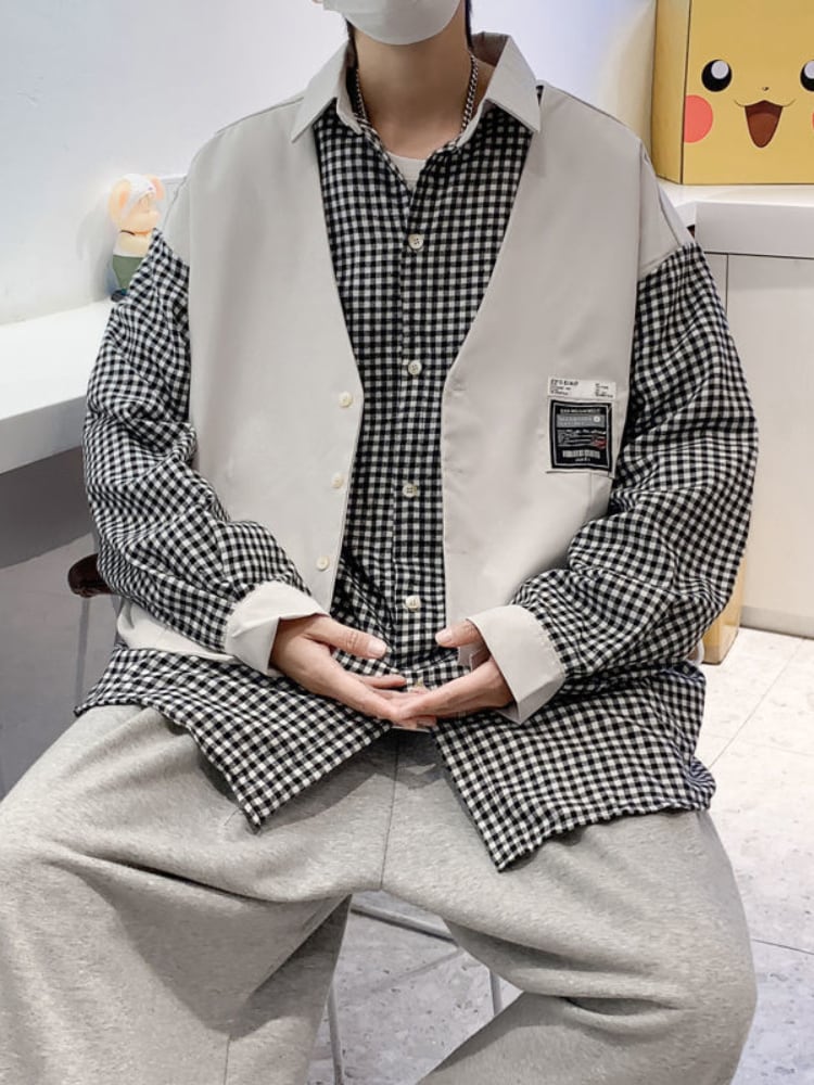 フェイク 2 個ベストシャツ格子縞の男性ブラウス夏黒特大原宿シャツ長袖春秋の男性服 ロング ブラック かわいい スプリング 春物 サマー 夏物 オータム 秋物 got45344066513