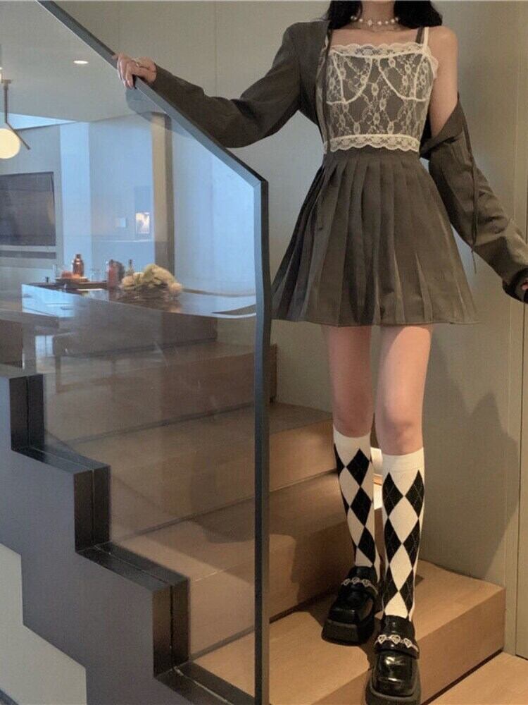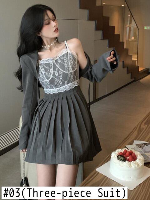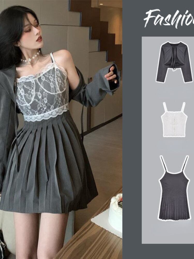 セクシーな女性スーツ グレー ブレザー ジャケット + レース タンク + スリング ドレス 3 個夏服オフィス レディ スーツ シック グランジ サマー 夏物 会社 学校 通勤や通学にも got88111765516