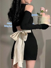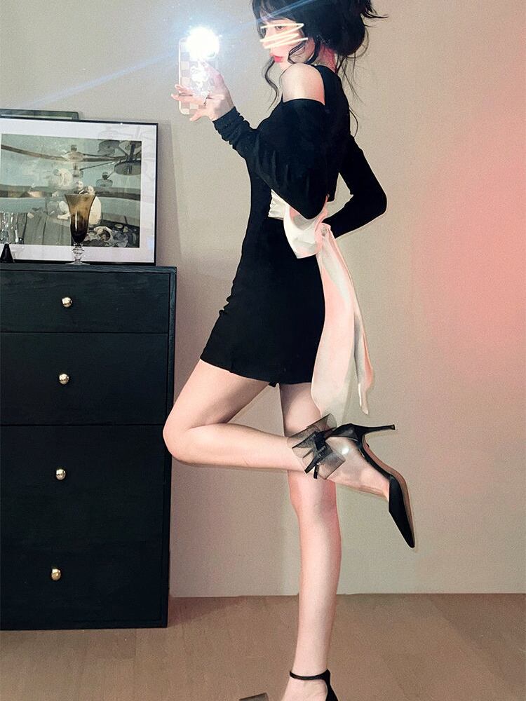 春の女性のスーツブレザー + ニットドレス 2 個弓ドレススキニースカートセクシーな黒のシックなスーツ ブラック リボン スプリング 春物 got62863547863