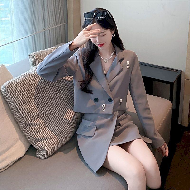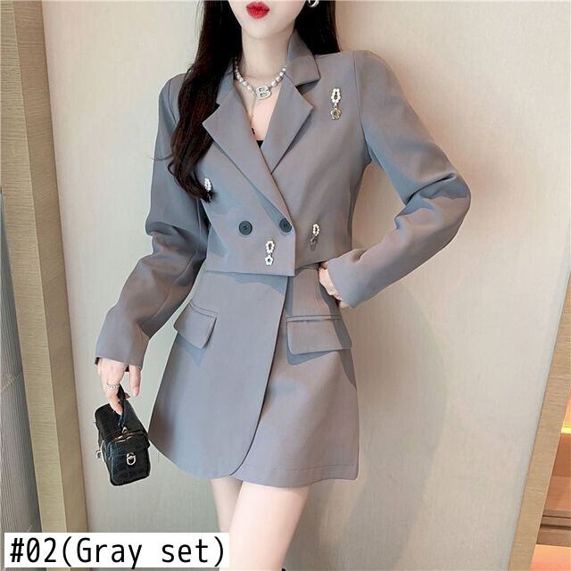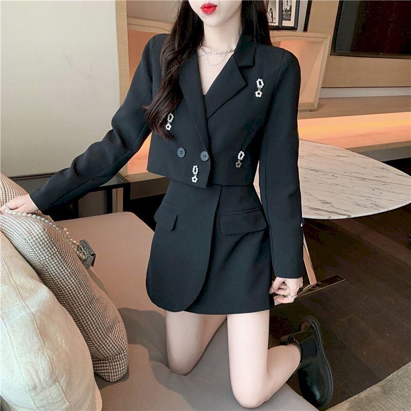 女性セットスーツブレザー + スカート黒無地春秋ジャケットウエストスカートツーピースオフィスレディ ブラック スプリング 春物 オータム 秋物 ソリッドカラー 会社 学校 通勤や通学にも got81029199768