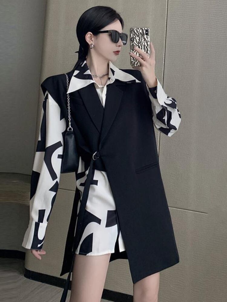 女性スーツ黒のベスト + シャツ 2 点セット非対称春レトロ緩い女性のストリートオフィスレディスーツ ブラック スプリング 春物 会社 学校 通勤や通学にも got31995698694