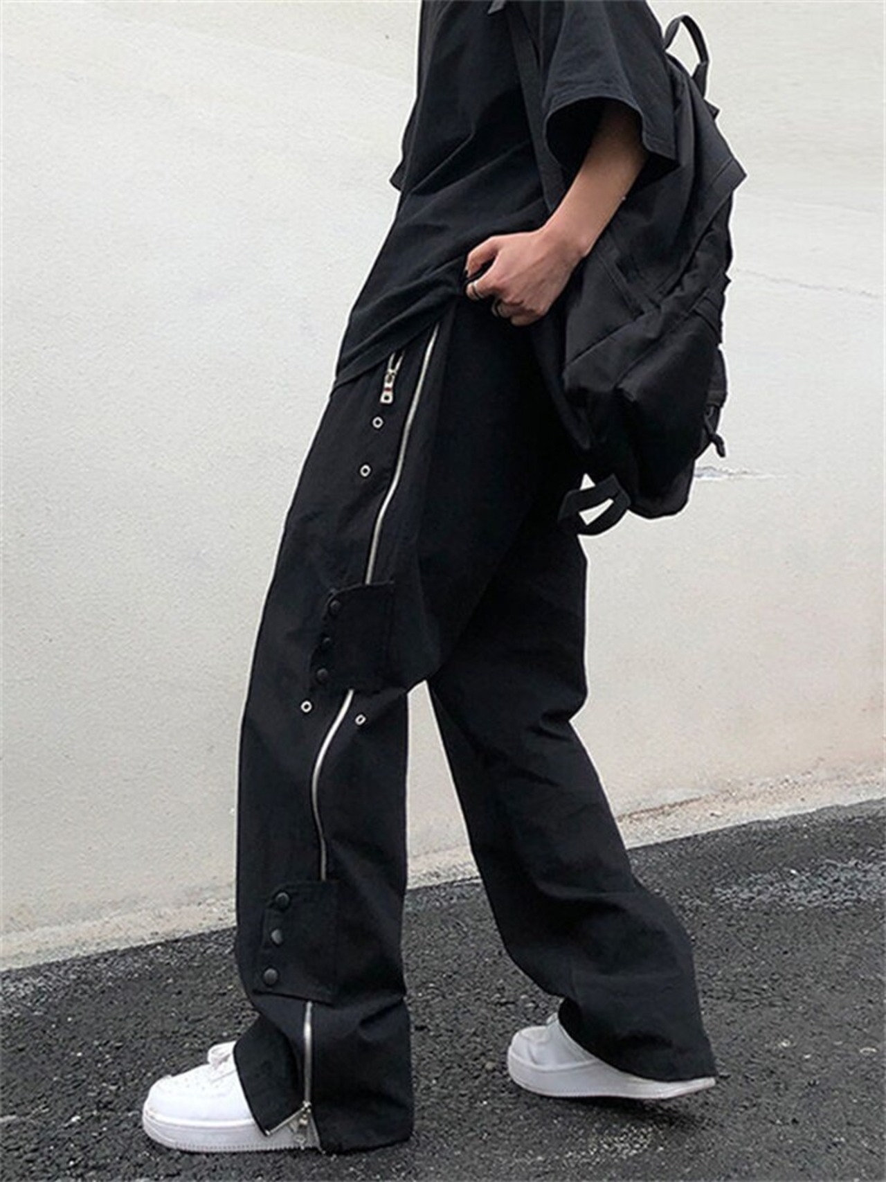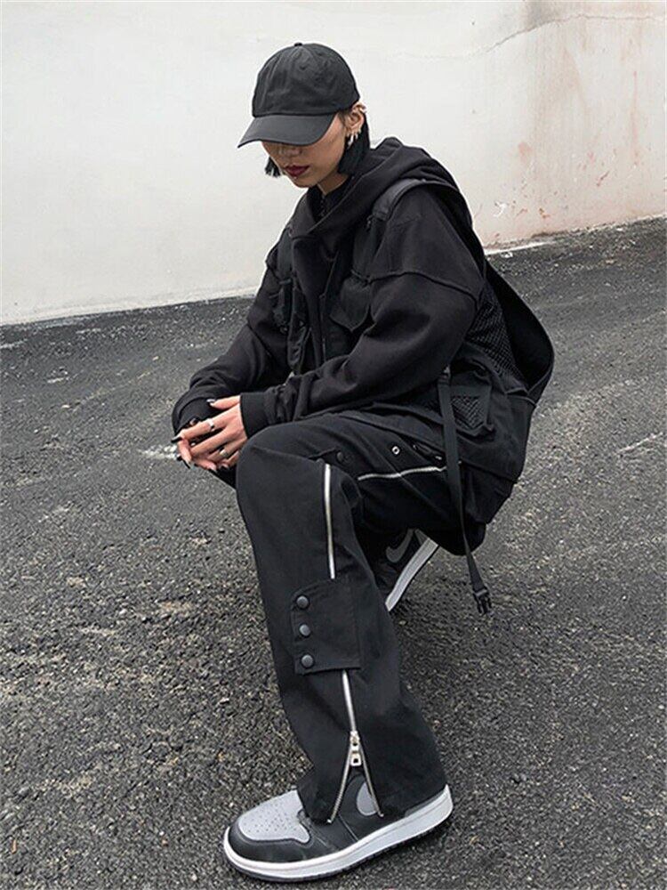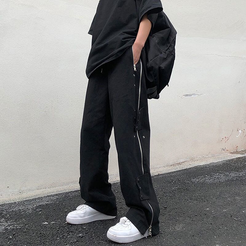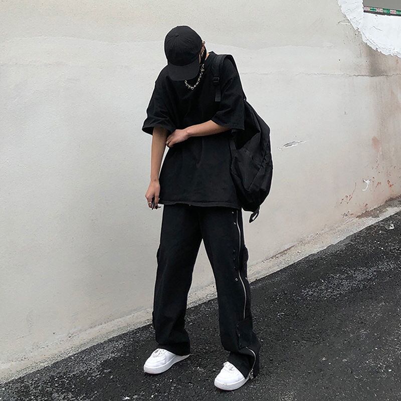 ゴシックパンクパンツボタンアップジッパー黒ワイド脚デニムだぶだぶカーゴパンツ ese 男性ストリートボトムストレートズボン ブラック ワイドレッグ ワイドパンツ got42523949354
