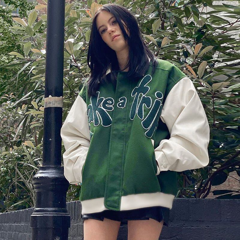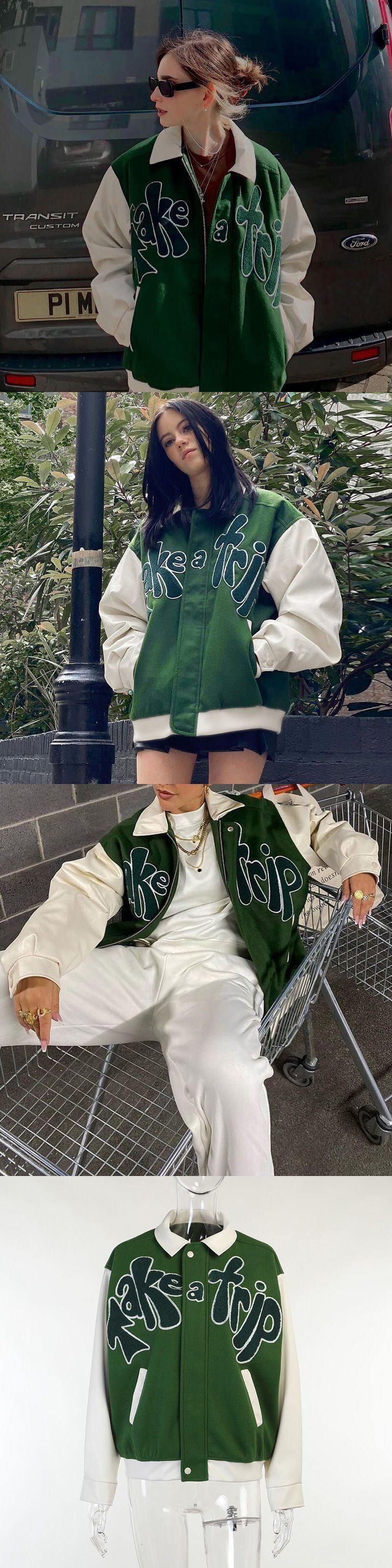 ボンバージャケット女性グリーンコントラストスリーブ PU レザーコートアウタートリップを取る手紙アップリケ秋の野球ジャケット オータム 秋物 got99751341100
