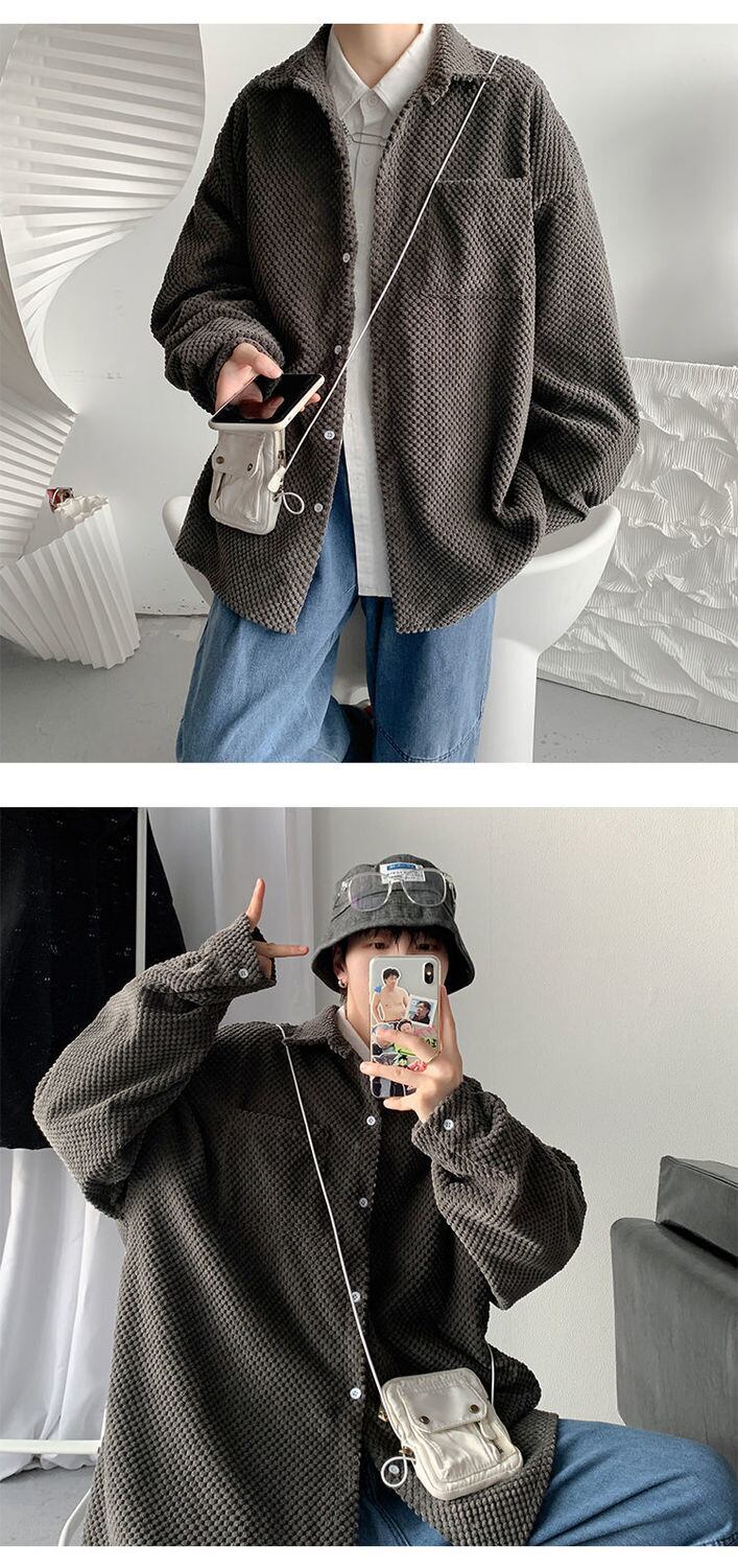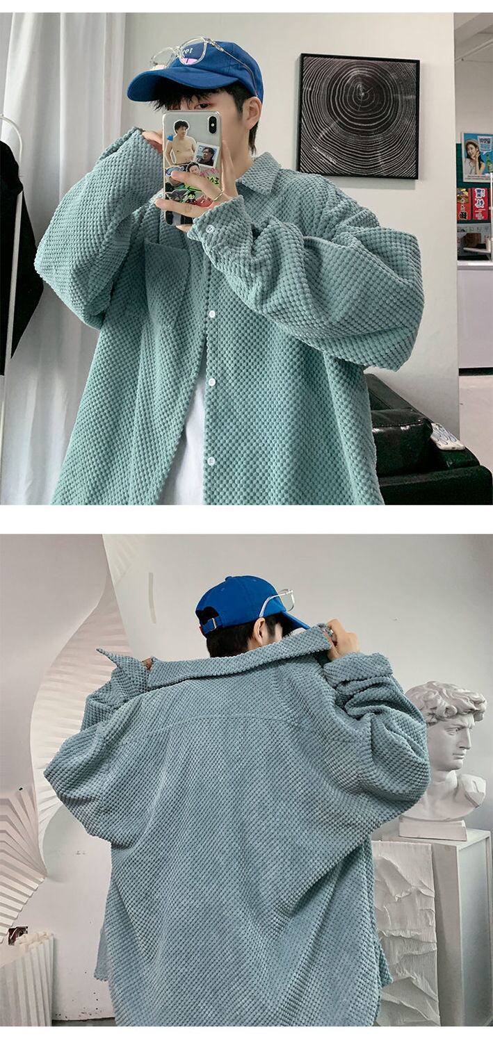 ワッフルコーデュロイシャツ男性女性布固体特大春シャツ長袖ストリートボタンアップブラウス ロング スプリング 春物 ソリッドカラー got46513760888