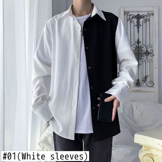 男性シャツ長袖黒、白ステッチシャツトレンド ese アウターだぶだぶストリート男性トップブラウス ロング ホワイト ブラック got72945978070