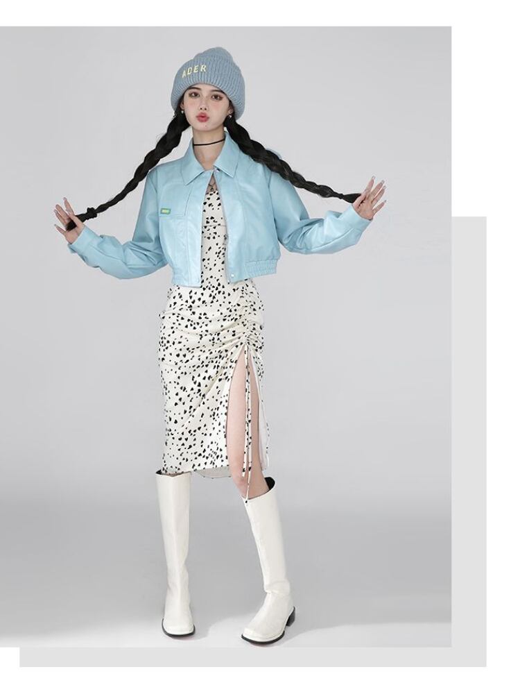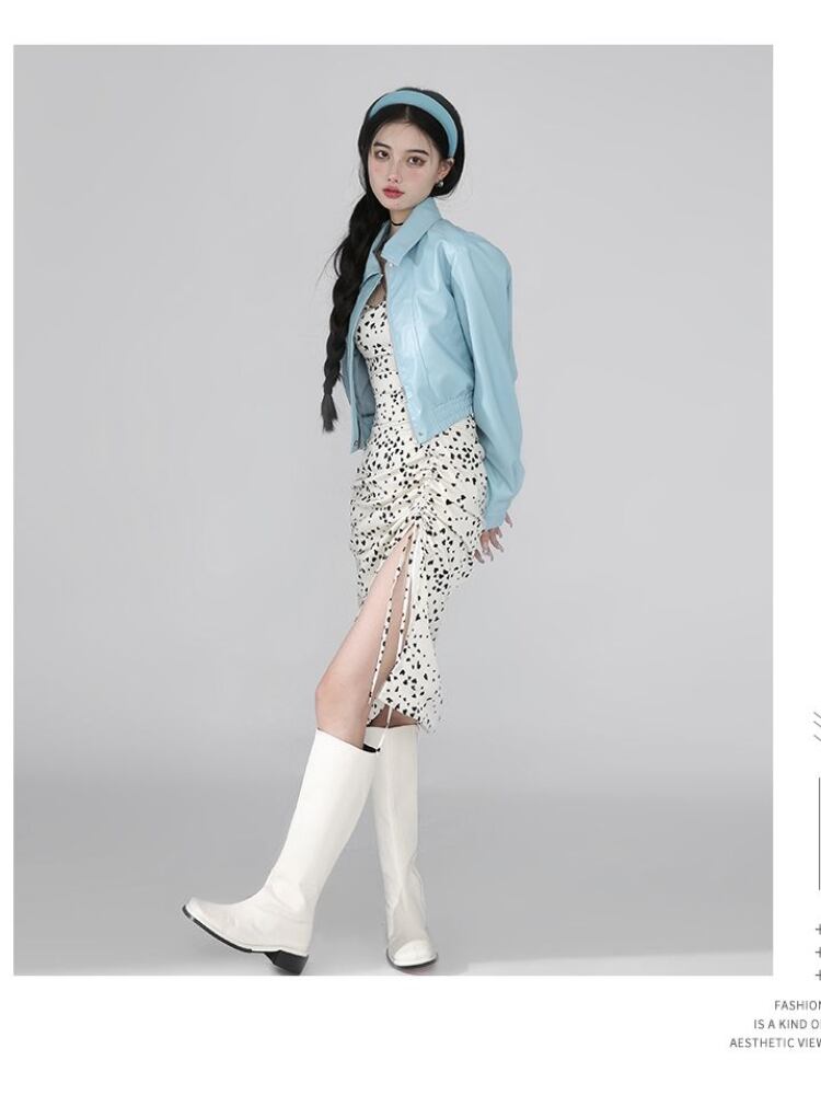 Gothiscyn 女性スーツ ブルー PU レザー ジャケット + スリング ドレス 2 ピース春オフィス レディ セクシーなシックなスーツ スプリング 春物 会社 学校 通勤や通学にも got33617473004