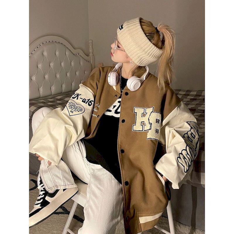 ストリート野球ジャケットボンバージャケットステッチフロック文字 PU レザー毛皮のコート女性秋冬女性服 オータム 秋物 ウィンター 冬物 got95122206525