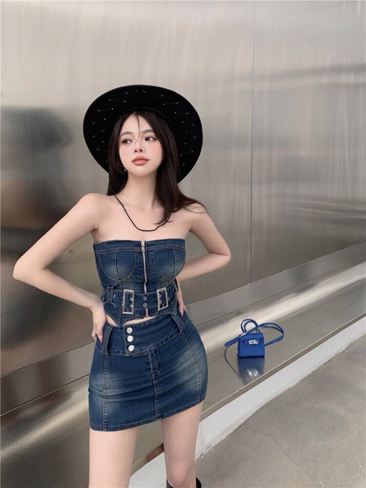 Gothiscyn デニムスーツ夏ホットガールチューブトップトップスカートツーピースタイトクロップトップ背中の開いたスーツ サマー 夏物 got3070926952