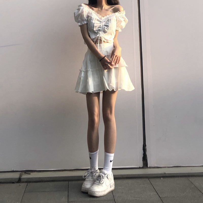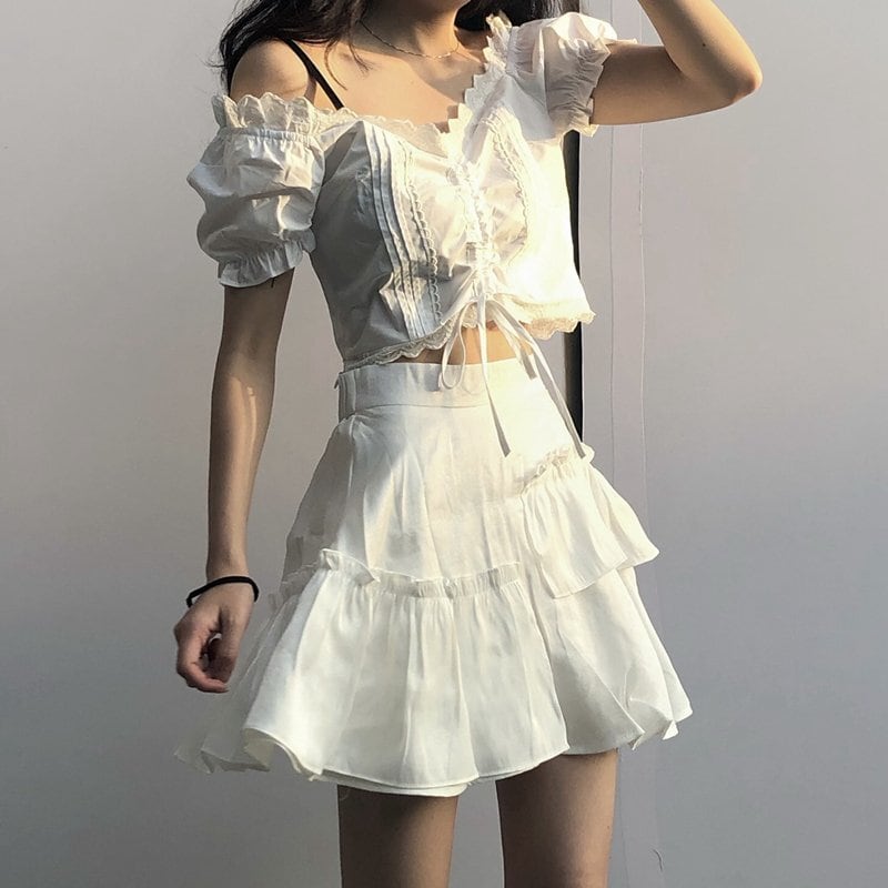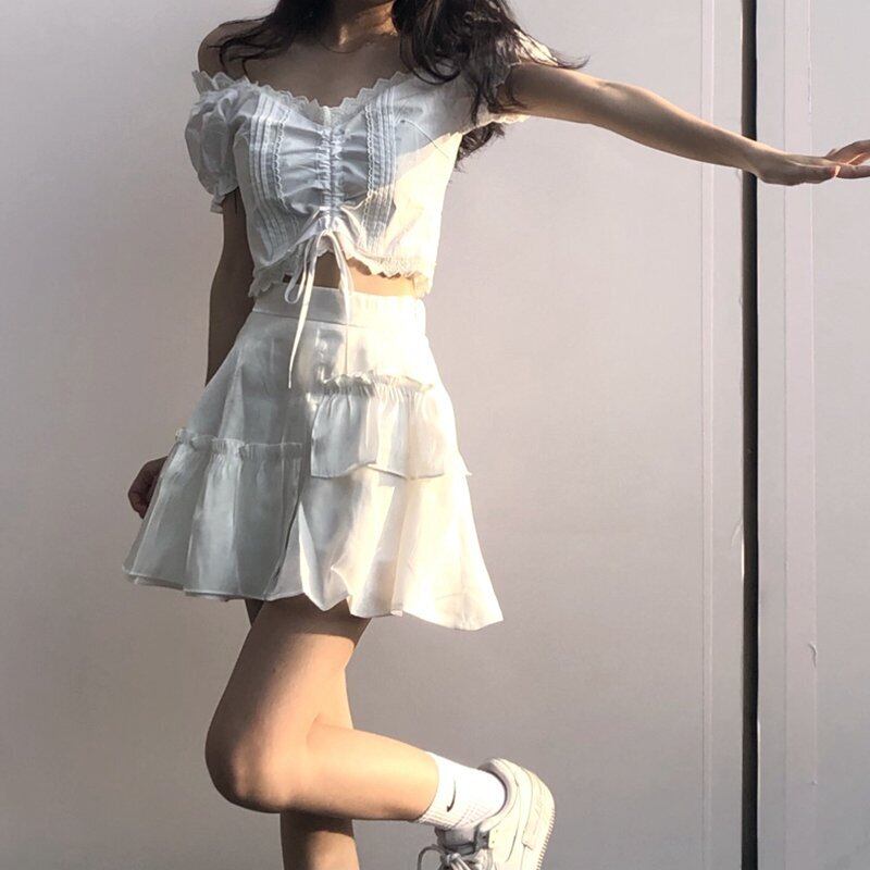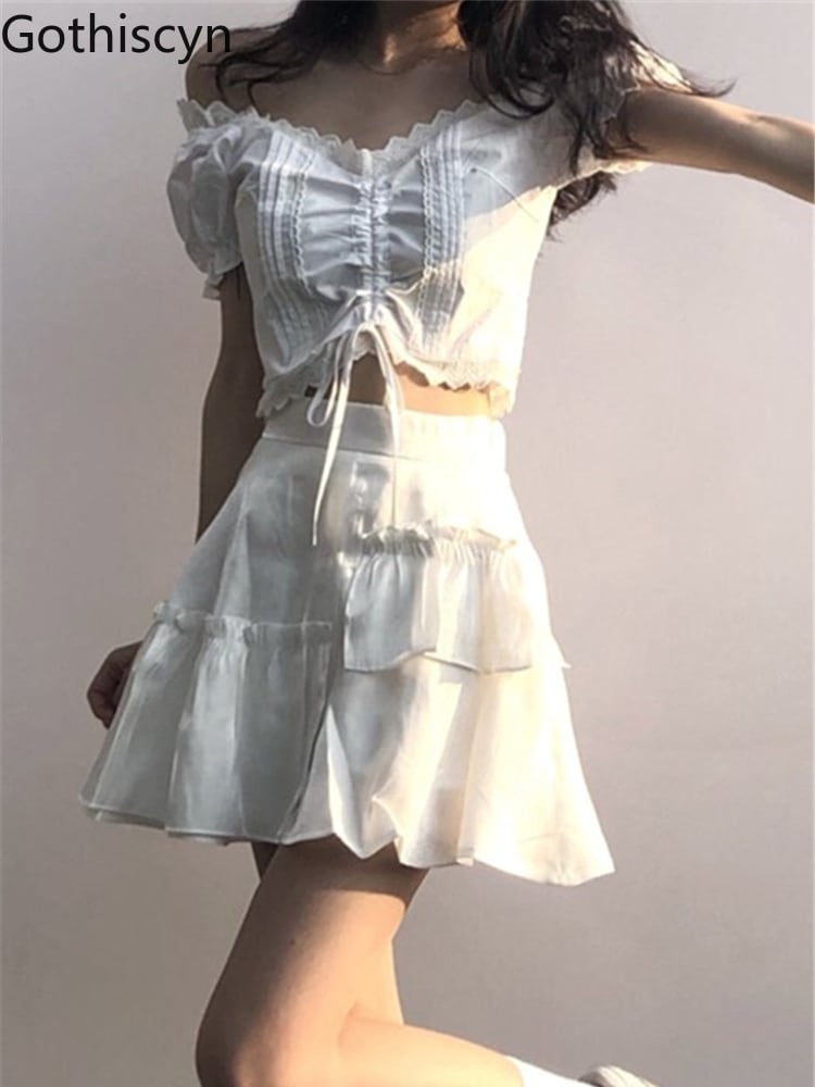 Gothiscyn オフショルダー ホワイト シャツ 半袖 クロップ トップ V ネック プリーツ スカート 2pc ホット ガール サマー アウトフィット ショート ハーフスリーブ 夏物 Vネック got38889145048