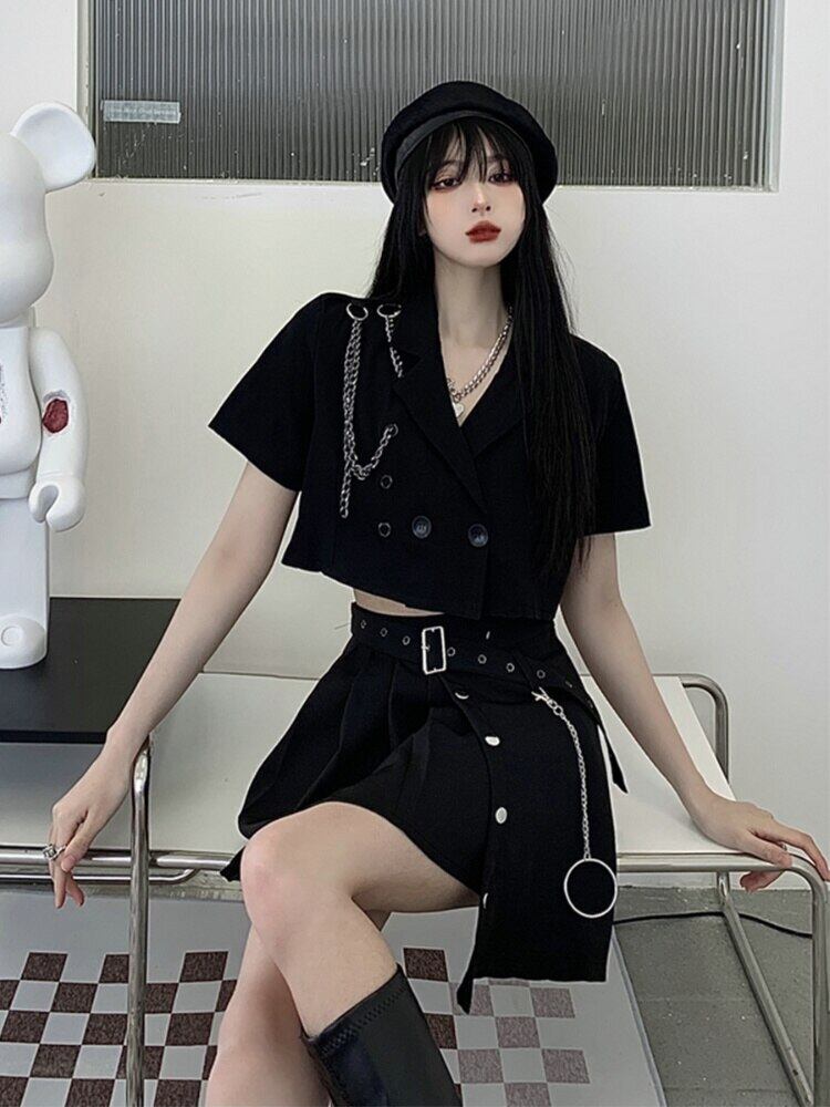 女性スーツ黒クロップブレザー + スカートセクシーなゴシックパンク 2 個チェーンパーティーガールストリートロリータスタイルの服セット ブラック got21350326863