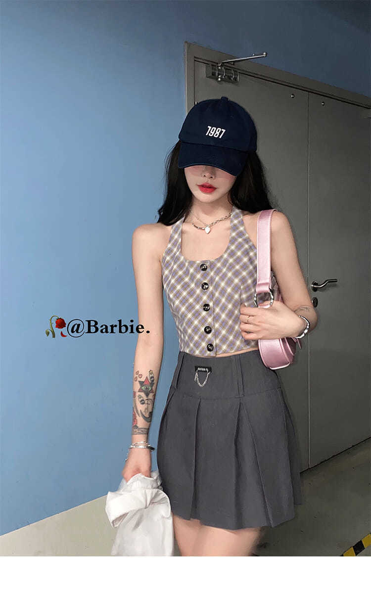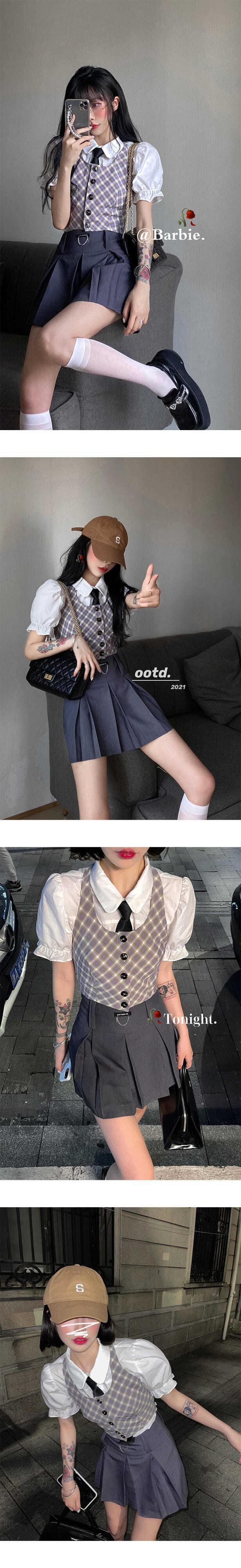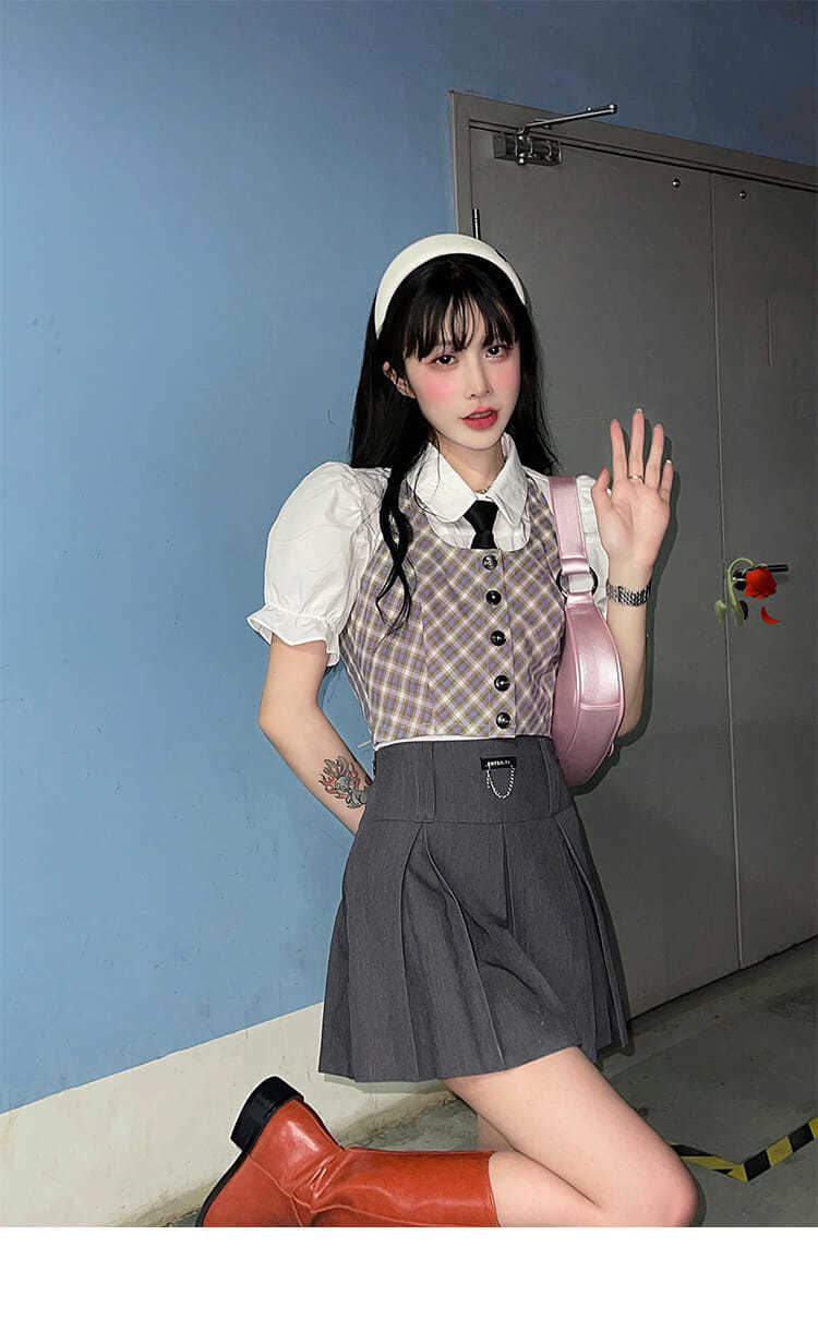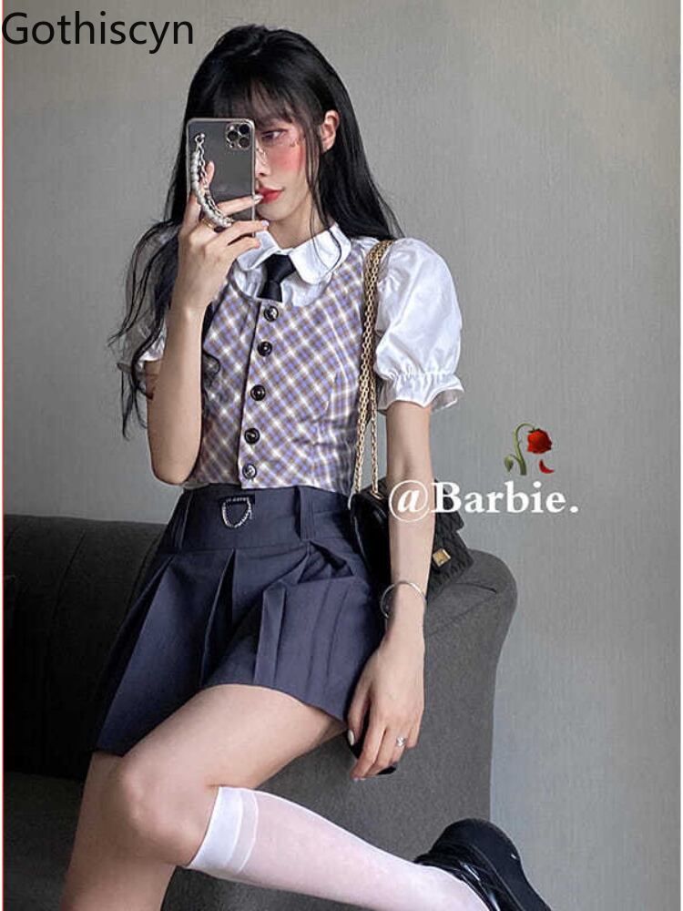 Gothiscyn プレッピー スタイル スーツ ベスト チェック柄シャツ トップ パフ スリーブ夏ショート スカート 3 ピース オフィス レディ シック サマー 夏物 会社 学校 通勤や通学にも got10294972606