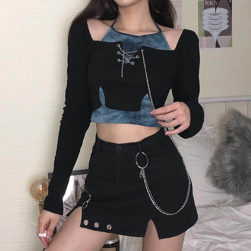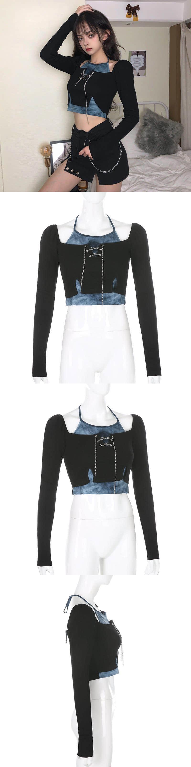 Y2k 絞り染めゴシックチェーン Tシャツパッチワークホルタークロップトップ女性の秋の長袖 Tシャツストリート ロング オータム 秋物 got13771300341