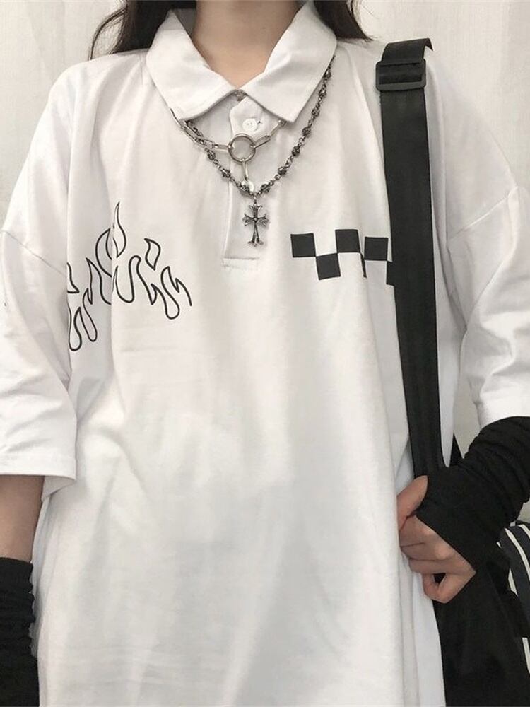 シャツストリート炎チェック柄プリントターンダウン襟半袖 Tシャツ女性男性夏ルースヒップホップ Tシャツ ショート ハーフスリーブ サマー 夏物 got99195980999
