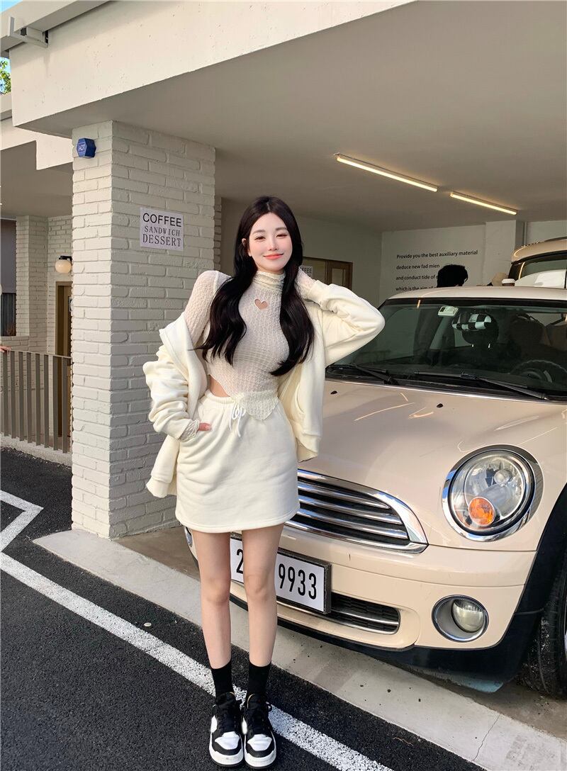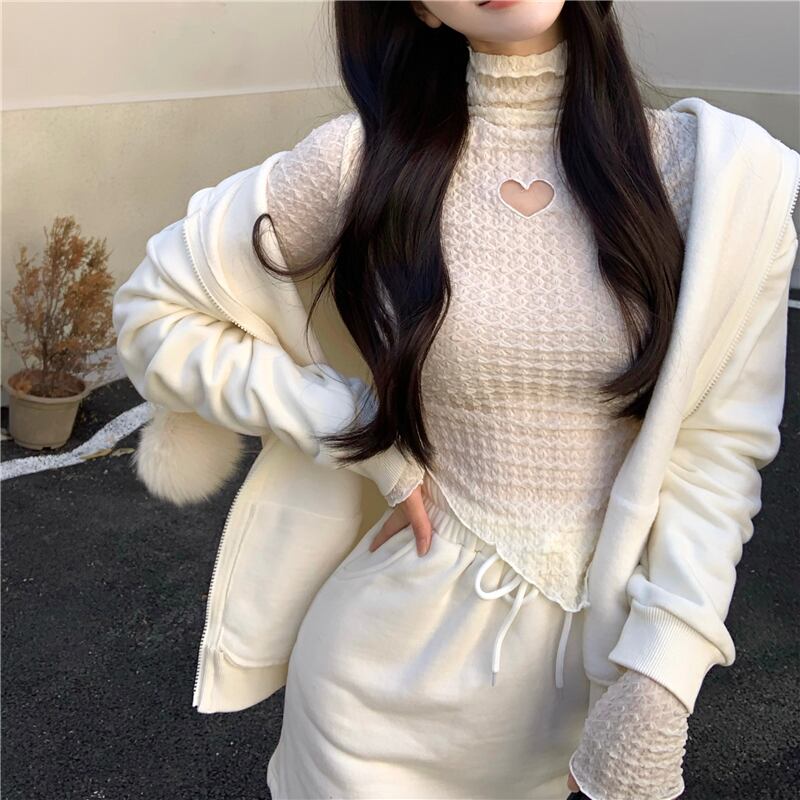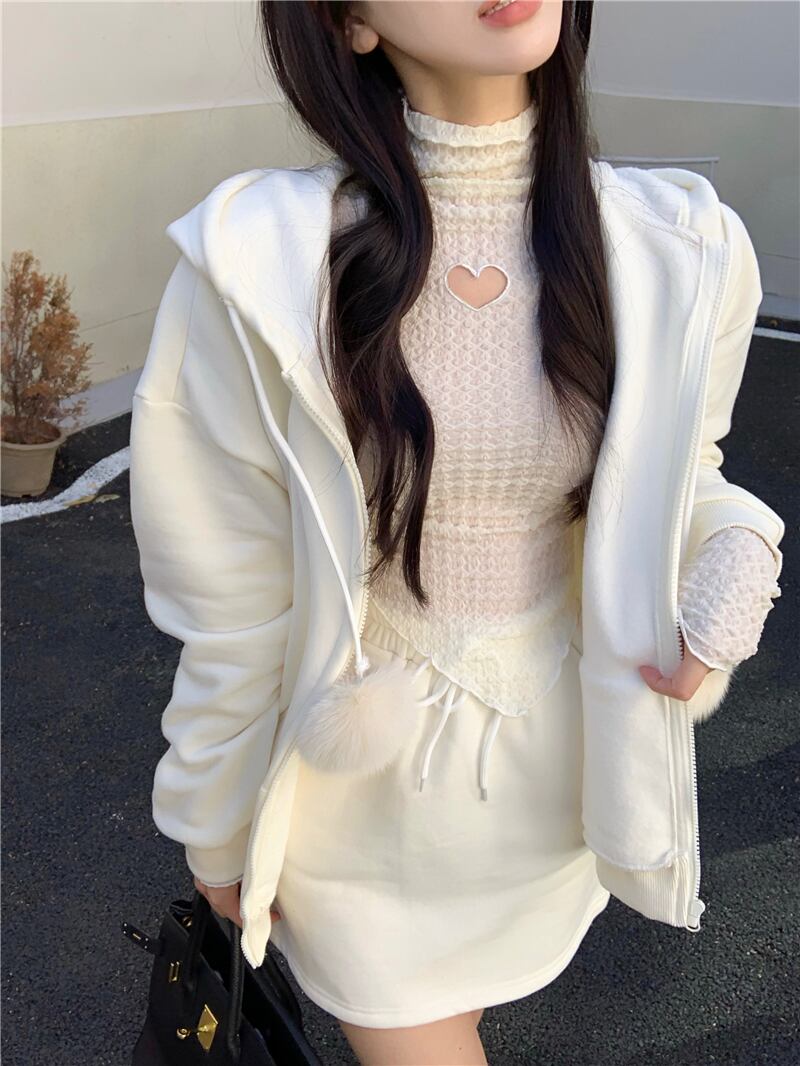 スウィートガールスーツ中空ハート底入れトップ長袖フード付き豪華なセーターコートウエストスカート 3 点セット服 ロング 大人ガーリー キュート カジュアル got19810271003