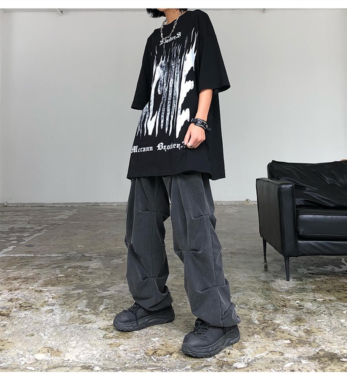 原宿パンツプリーツ黒人女性ズボンワイドレッグパンツゴシックパンクウエストストレート男性ボトムカーゴパンツ女性 ブラック かわいい ワイドパンツ got35416633466