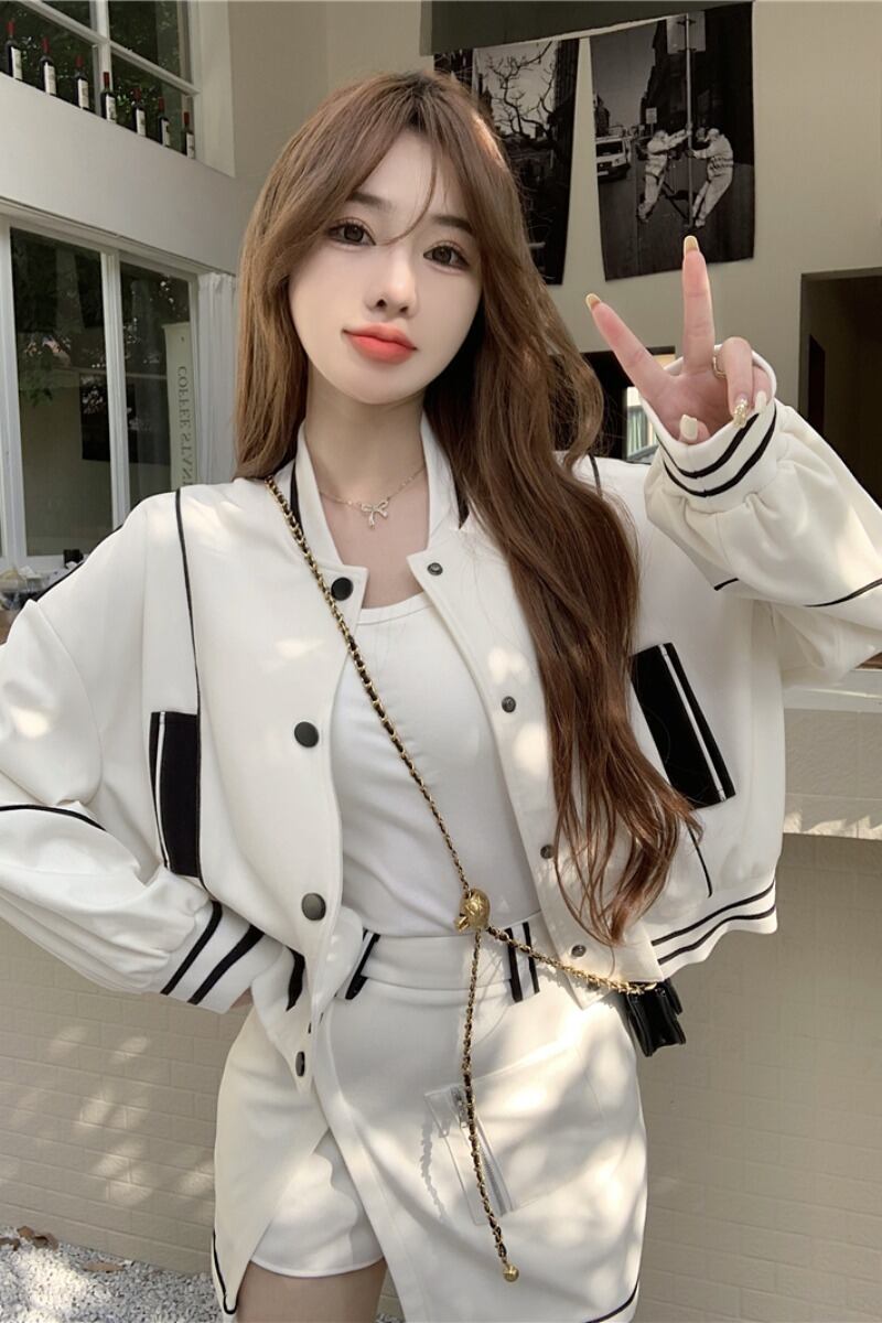 アメリカン レトロ 白黒 コントラスト ベースボール ジャケット スモール ショート コート レディース イレギュラー スプリット スカート 2点セット ホワイト ブラック got56812376133