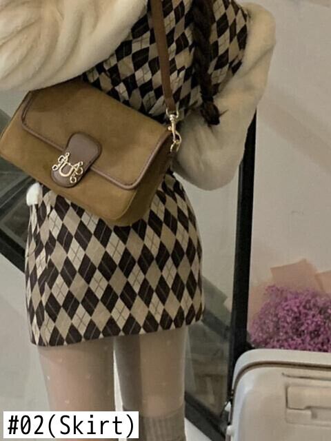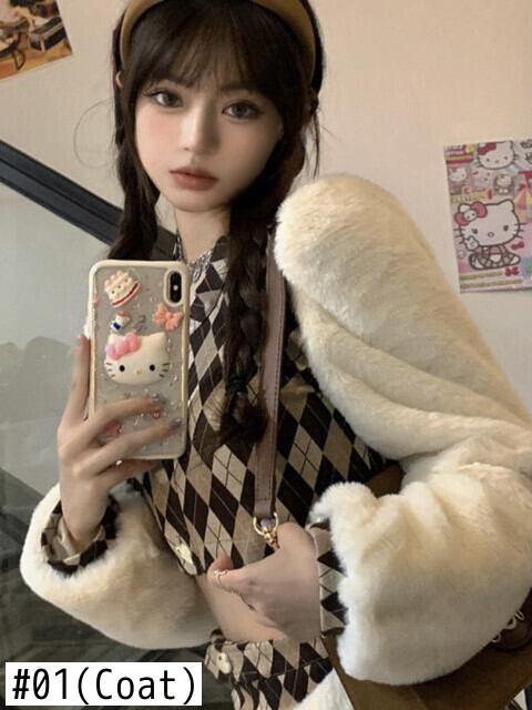 女性スーツブラウンレトロチェック柄ジャケット fuax 毛皮のスーツの服秋冬アメリカのセクシーなクロップスカート 2 枚セット オータム 秋物 ウィンター 冬物 got20370701606