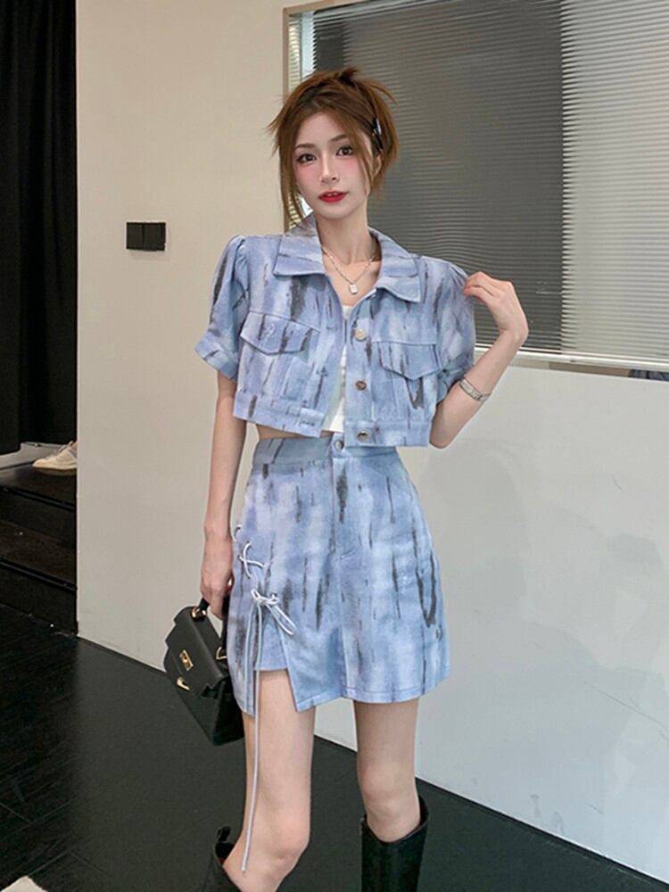 カーディガンクロップツーピースセットホットガール絞り染め夏ショートスタイルシックな半袖コートスカートスーツ ハーフスリーブ サマー 夏物 got78232904000