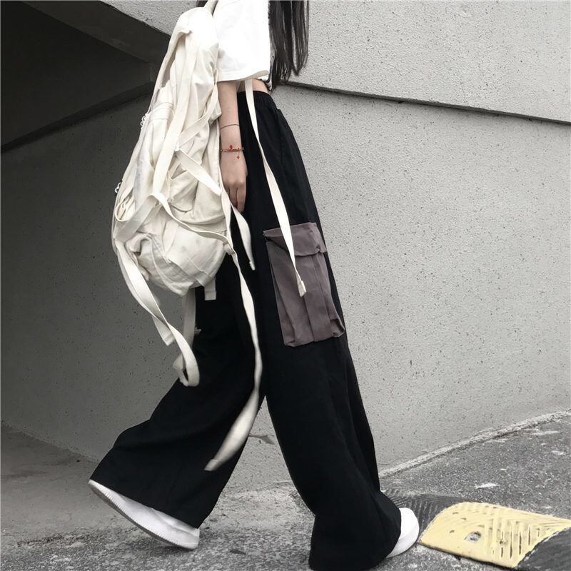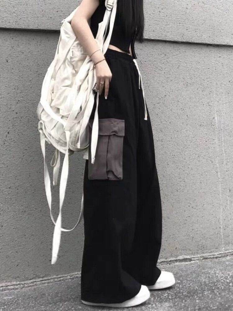 女性パンツ黒ワイドレッグパンツビッグポケットだぶだぶのズボンカーゴパンツゴスパンクストリートウェアユニセックスボトムス春緩い ブラック スプリング 春物 ワイドパンツ got72336210794