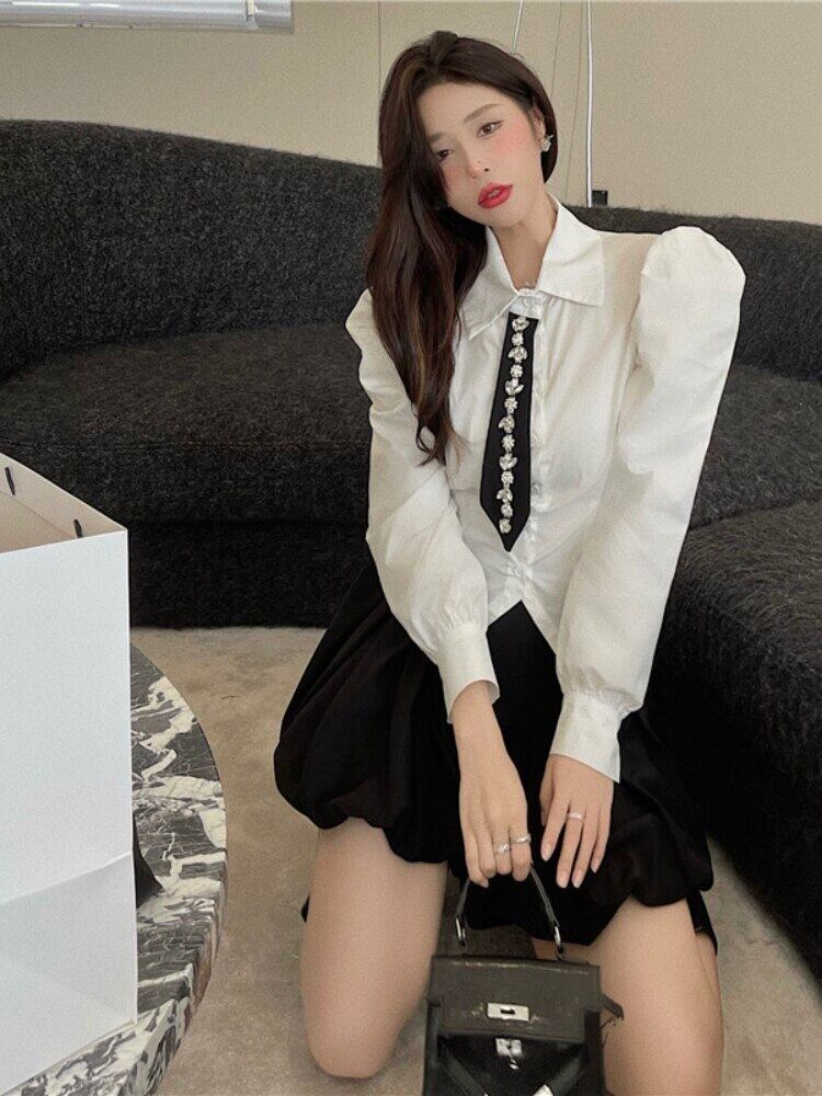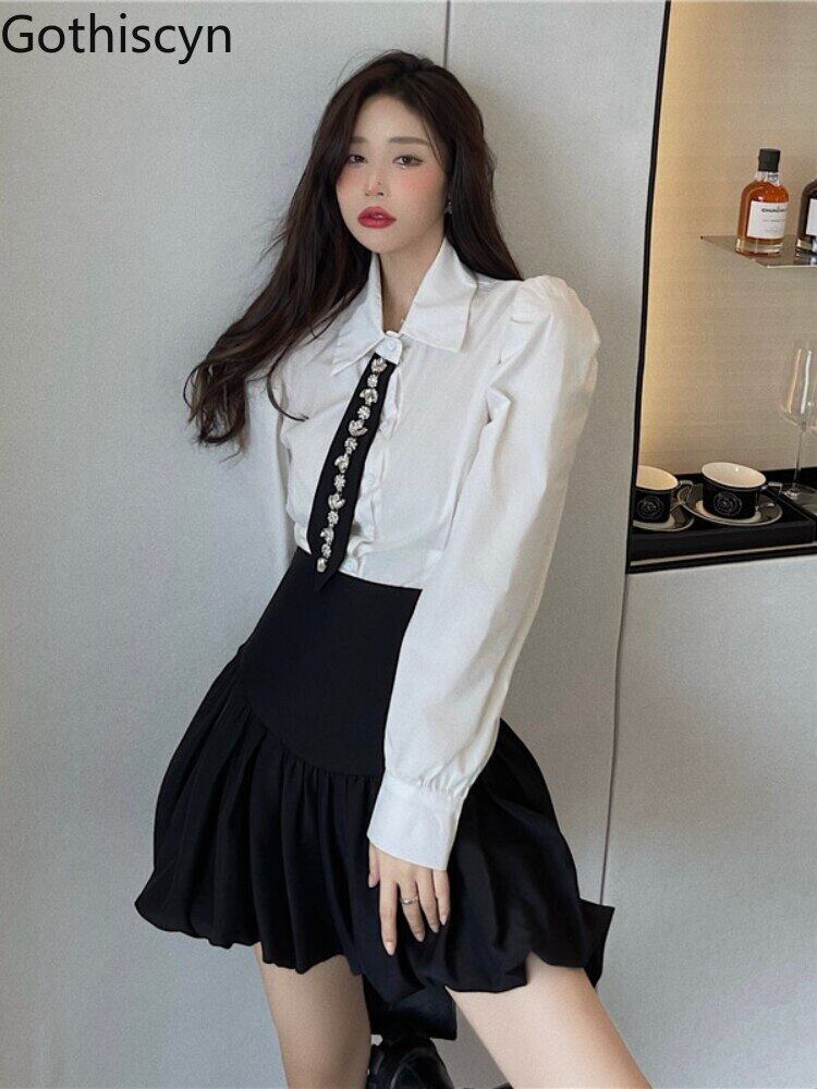 プレッピースタイルツーピーススーツ女性ロングパフスリーブボタンアップシャツ秋白シャツウエスト薄いプリーツショートスカートスーツ ホワイト オータム 秋物 got23811510008