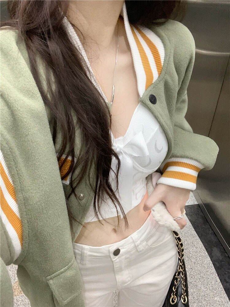レトログリーン野球ジャケット長袖コート冬服女性原宿フレンチルーズレディース薄いトップ ロング かわいい ウィンター 冬物 got53961485101