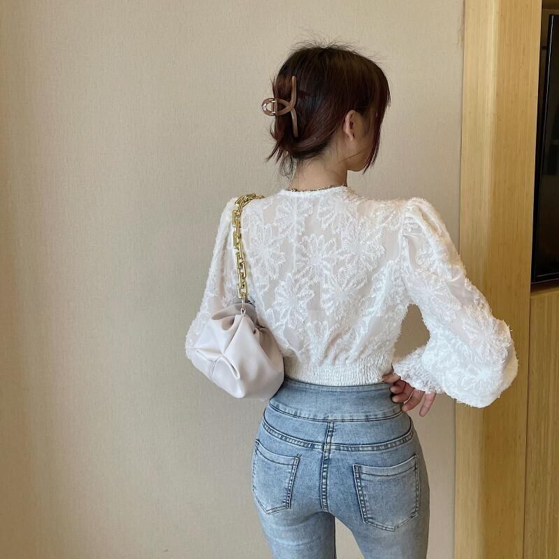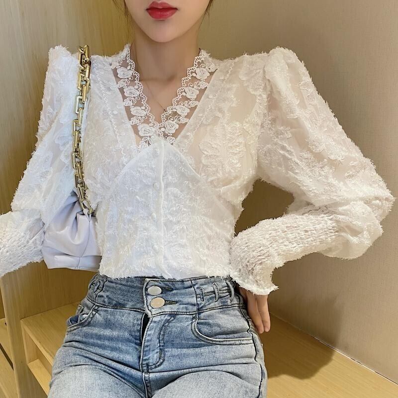 秋のセクシーな女性のシングルブレストウエストスリムブラウスフレンチスタイルの女性の V ネック長袖レースシャツトップ ロング オータム 秋物 Vネック got83415896895