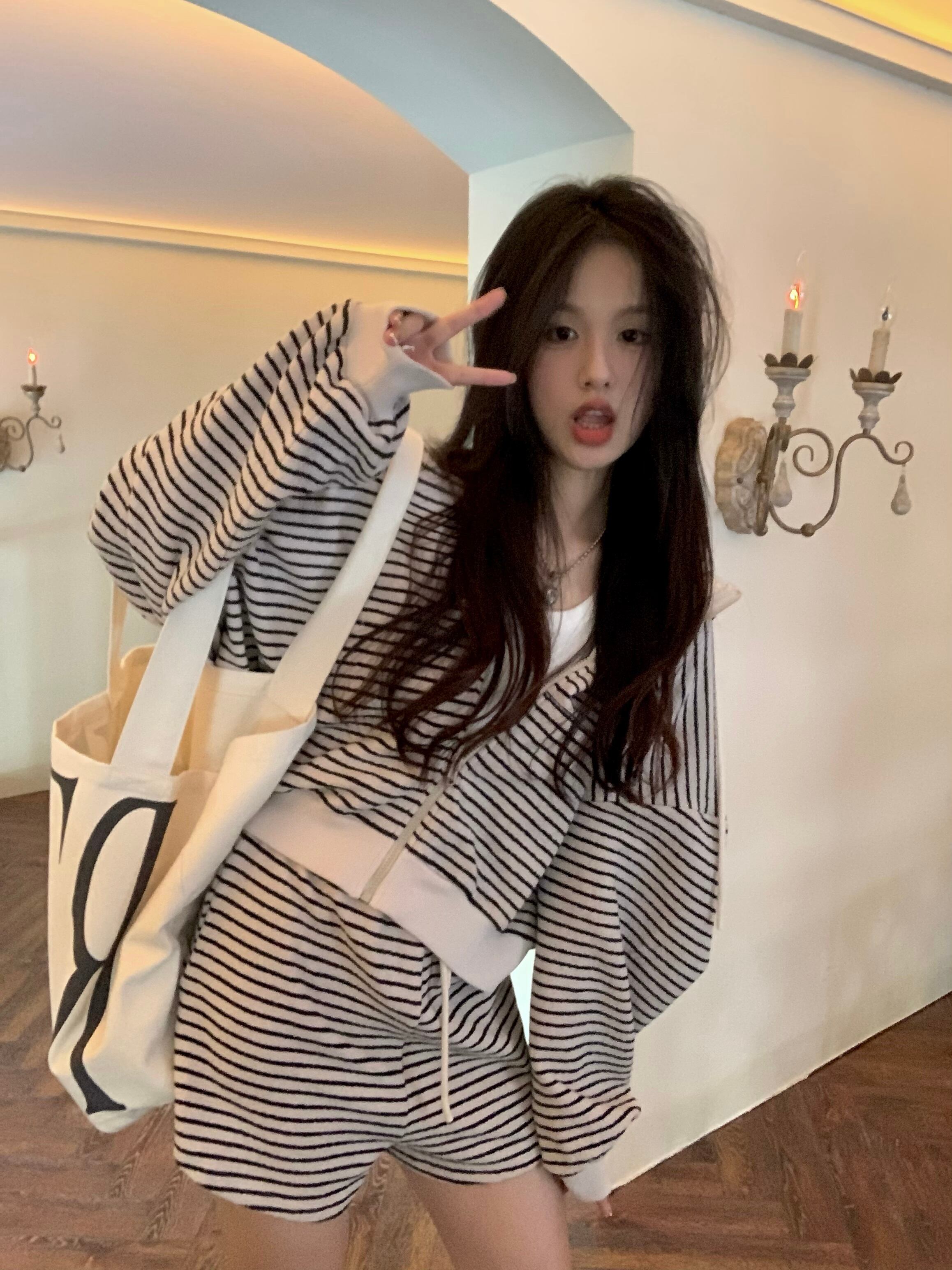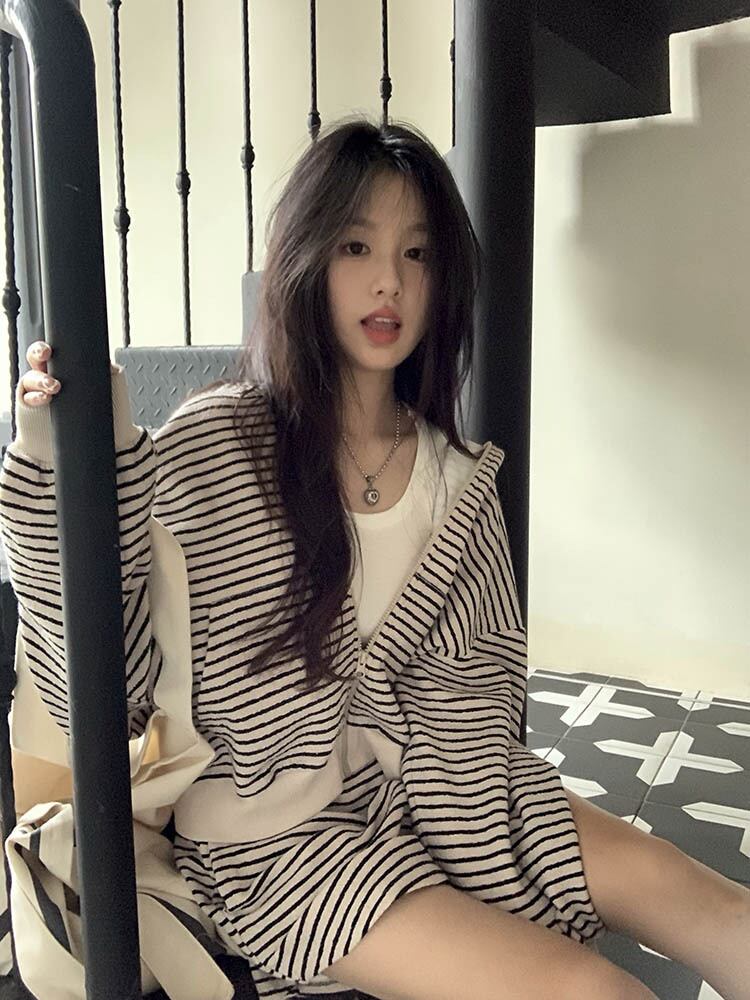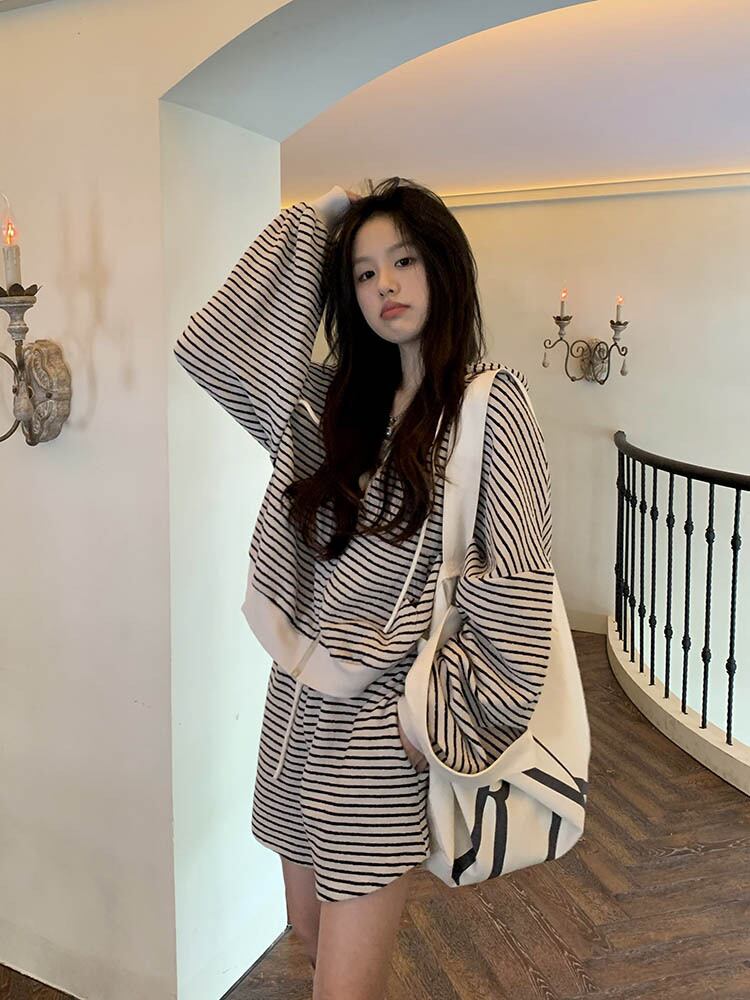 ツーピースセットレディース衣装ストライプスーツフード付きセーターコートワイドレッグショーツパンツ梨花服秋セット オータム 秋物 ブルマー ワイドパンツ got16014700094