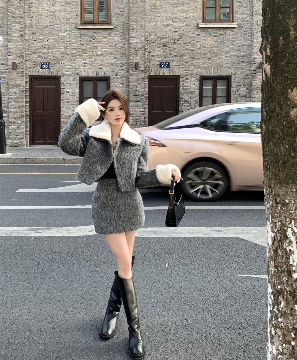 ウールのスーツの女性の冬フレンチ レトロ スタイル無地ショート コート ウエスト A ライン スカート 2 点セット服 ウィンター 冬物 Aライン ソリッドカラー got19073861282