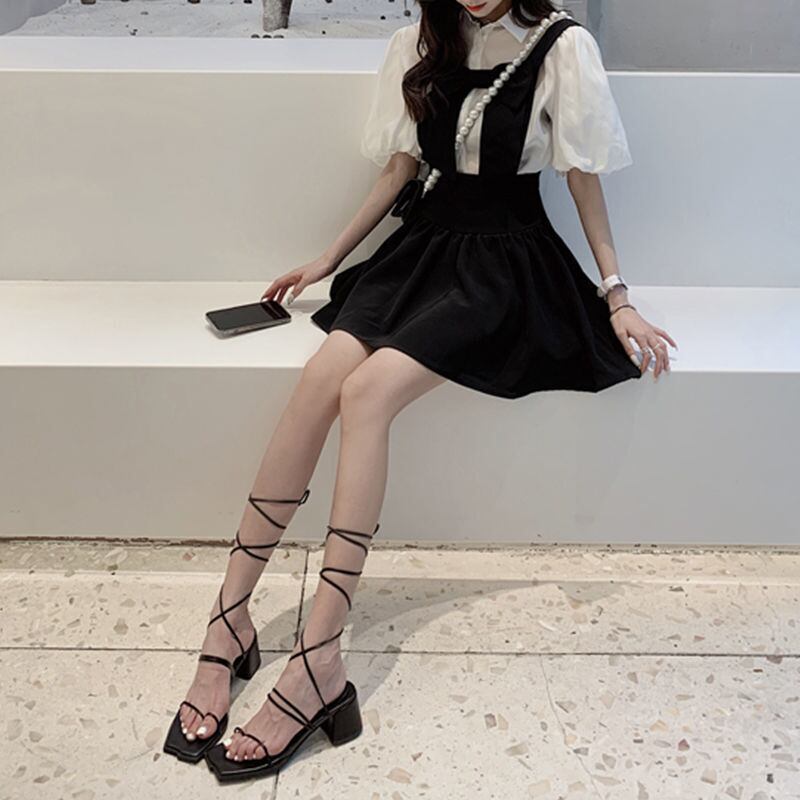 ツーピースサスペンダースーツスカート女性弓パフスリーブシャツ夏シックなシャツプリーツスカート女性スーツ リボン サマー 夏物 got31789787064