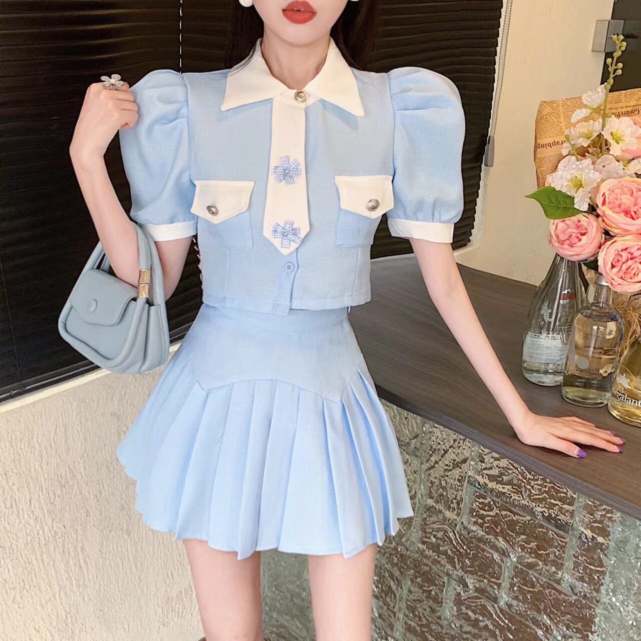スウィート ガール スーツ女性の夏のスタイル カラー コントラスト バブル スリーブ トップ プリーツ スカート 2 点セット服 大人ガーリー キュート カジュアル サマー 夏物 got89417320869