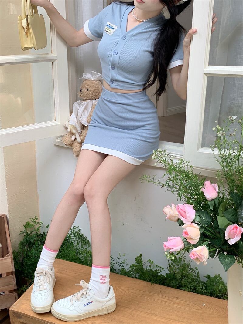 ホット女の子純粋に望まスーツ女性の V ネックショートカーディガンウエストスリムフィットショートスカートツーピースセット服 レッド Vネック got82982853103