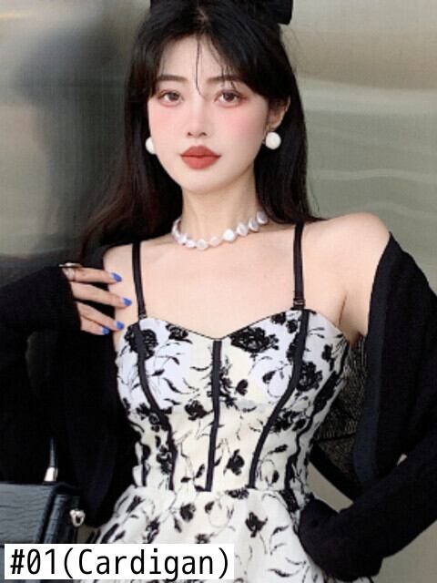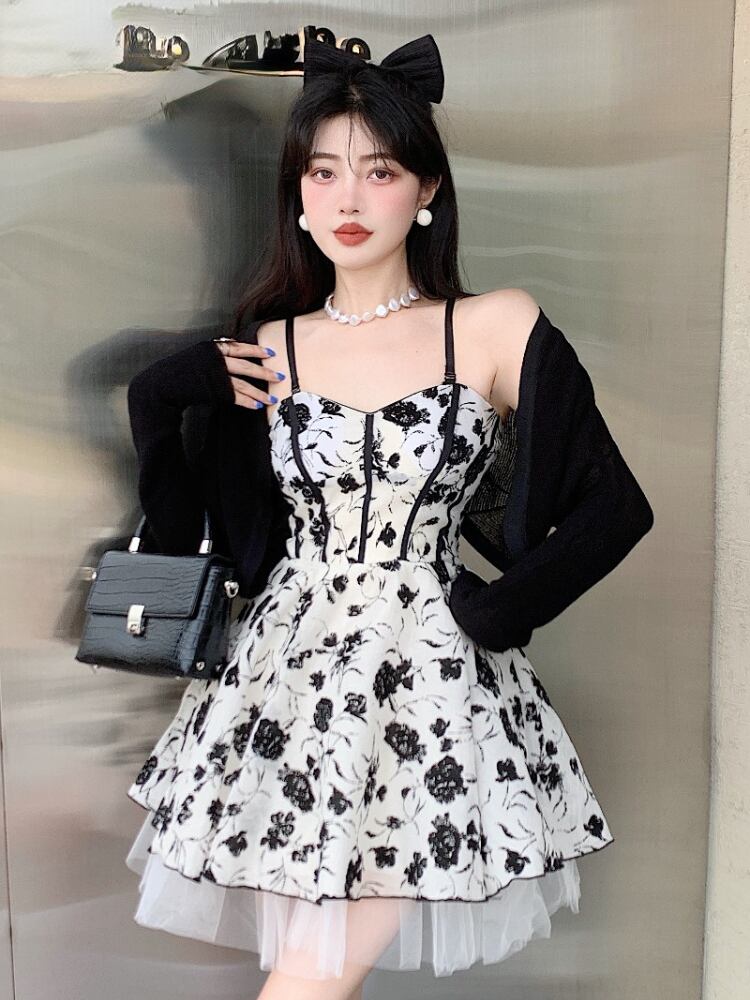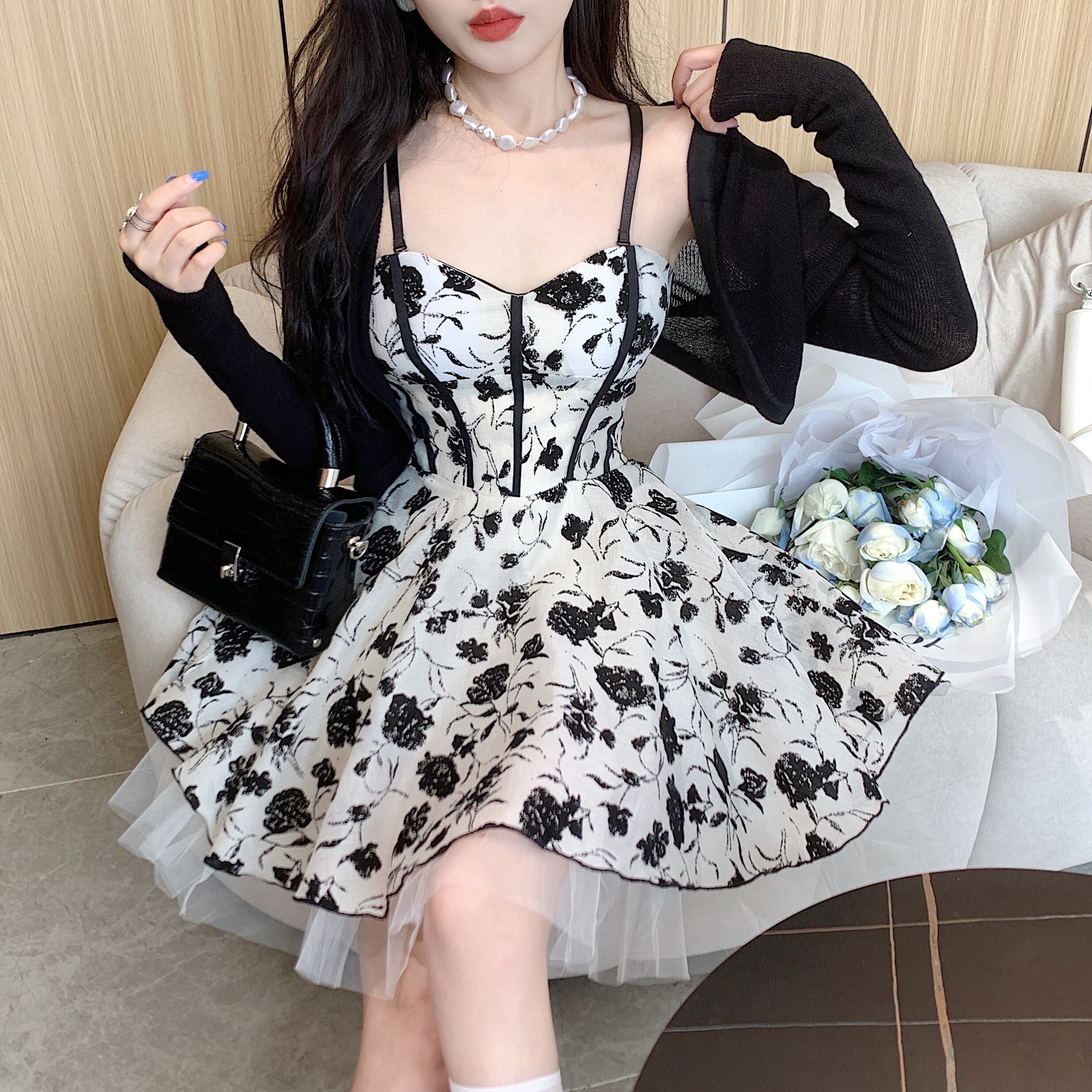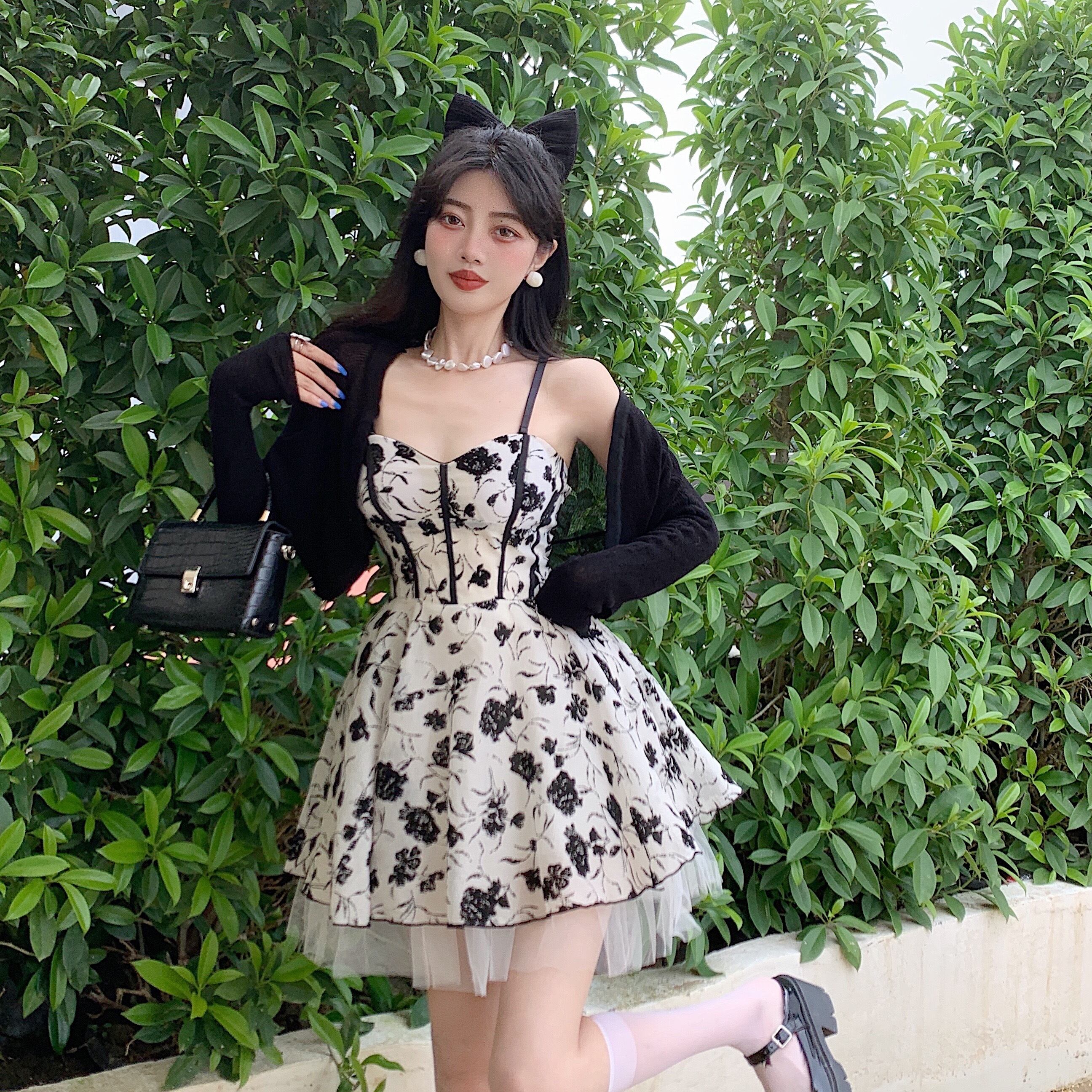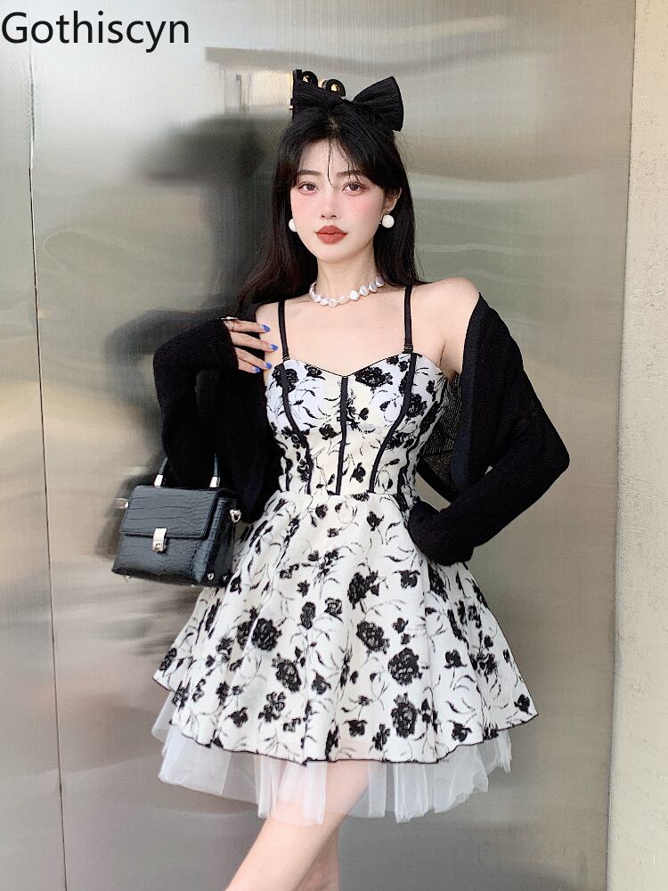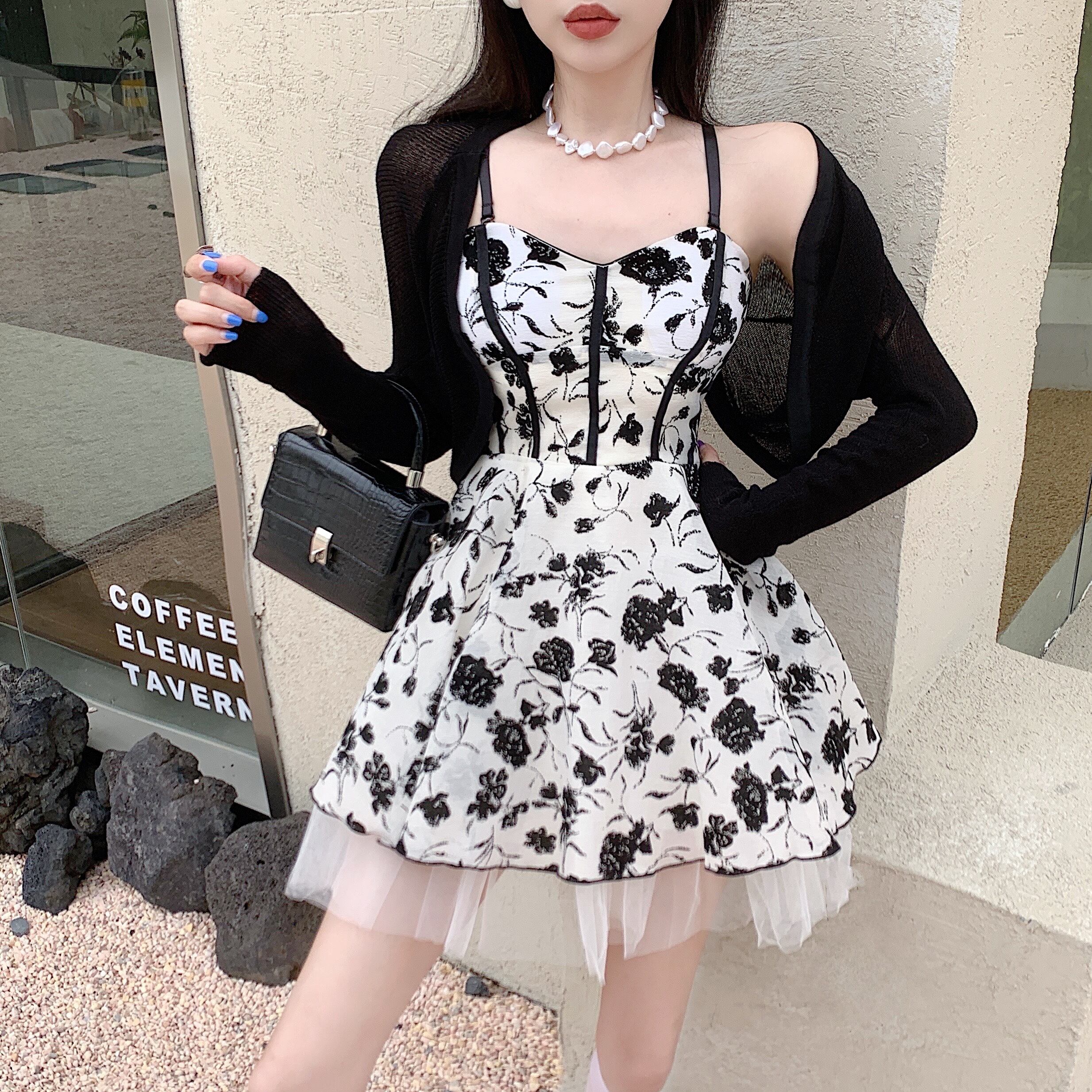 Gothiscyn 花メッシュサスペンダードレス黒日焼け止めカーディガントップツーピースの女性の夏のスーツセクシーな女性のローブ Vestidos ブラック サマー 夏物 花柄 got99923516103