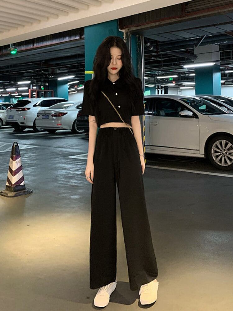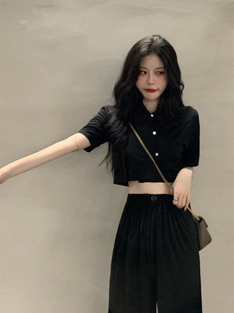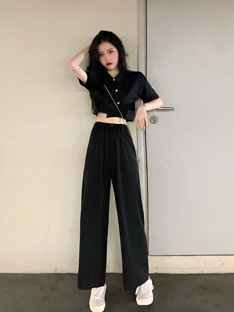 女性の夏のスーツクロップシャツ + パンツ 2 点セット黒服スーツストリートシックなストレートズボン ブラック サマー 夏物 got43664649913