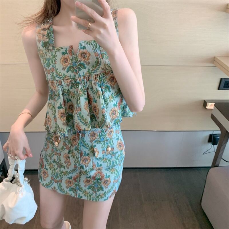 フレンチスタイルのスーツの女性の夏のノースリーブ花柄ベストスカートツーピースセットの服 サマー 夏物 got5243960593