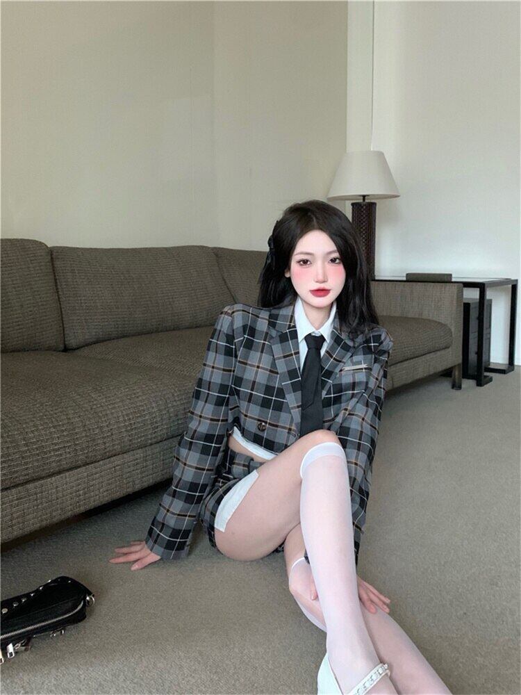 Gothiscyn レディース スーツ 長袖 クロップド ジャケット ミニスカート 無地 ブラウス 3点セット 春スタイル ロング スプリング 春物 ソリッドカラー got64578621455