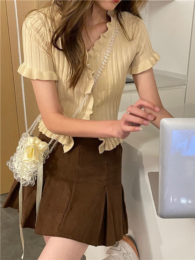 女性セットニット Tシャツ + スカート 2 個スキニー V ネックカーディガンアプリコットショート夏プリーツミニスカート女性服 サマー 夏物 Vネック got81603159938