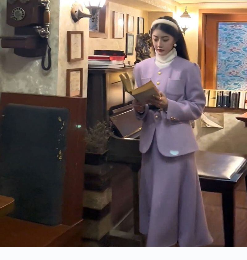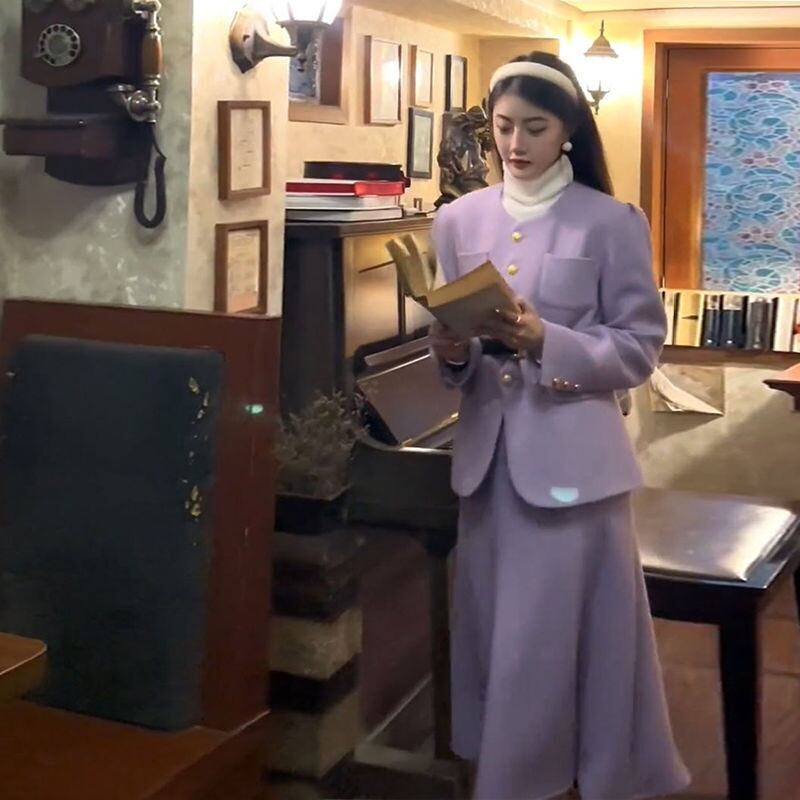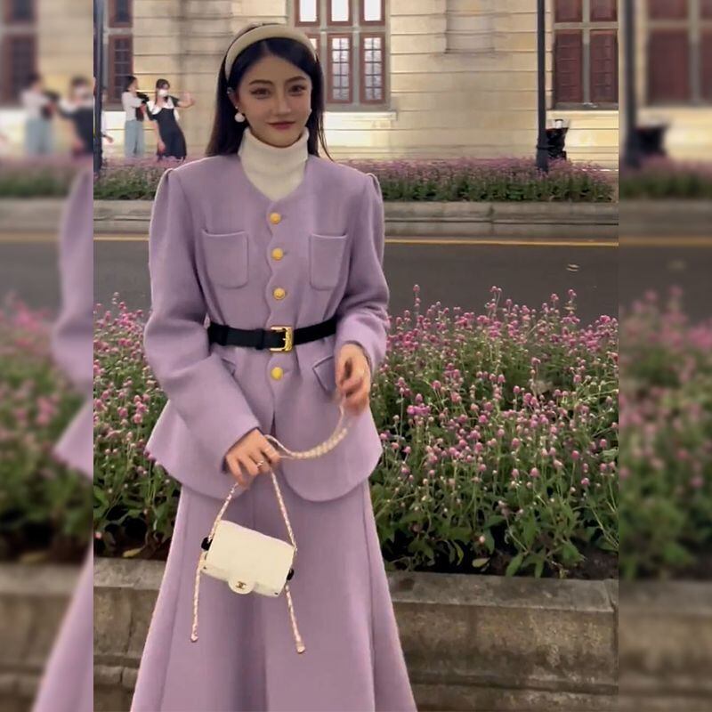 秋と冬のフランスのスーツの女性の紫色の長袖 O ネック コート ベルト付きウエスト ロング スカート 2 点セット服 オータム 秋物 ウィンター 冬物 ハーネス Oネック パープル got6162482555