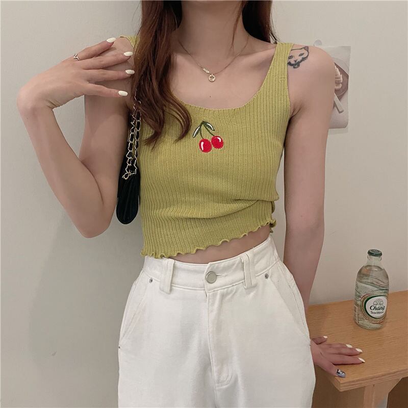 レディーストップスキャミソールタンク夏チェリー刺繍ニットノースリーブ Y2k トップクロップ十代の少女セクシーなスキニー服 サマー 夏物 got60926309812