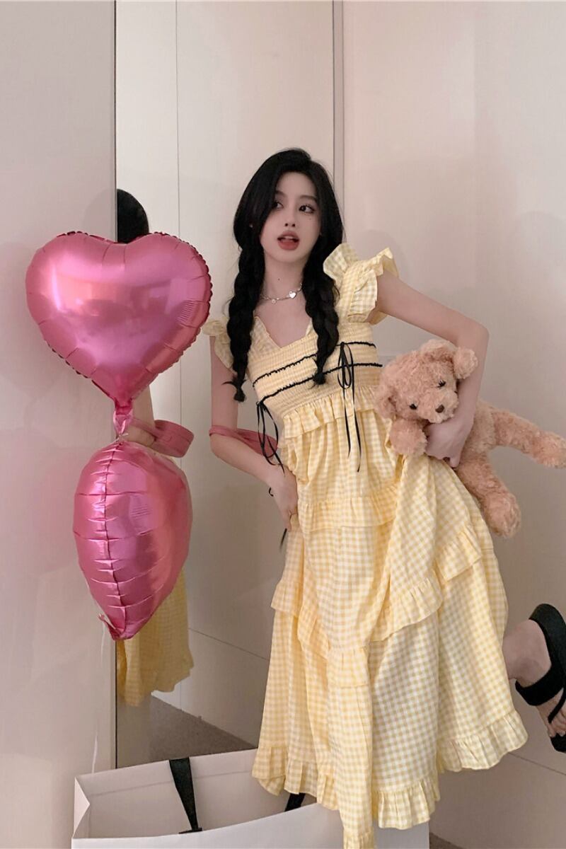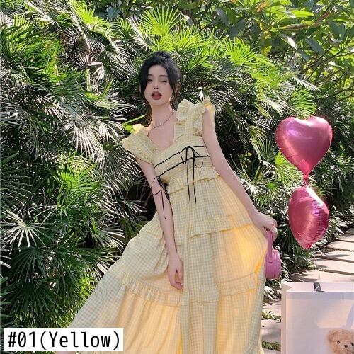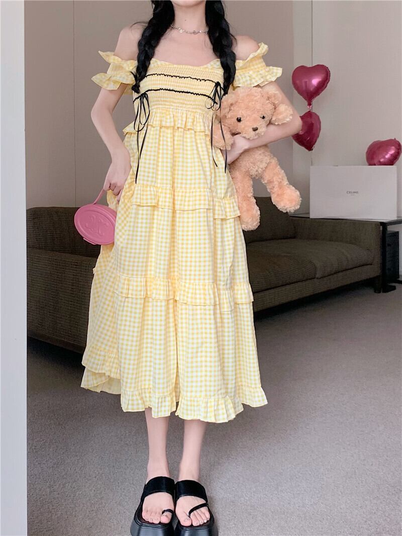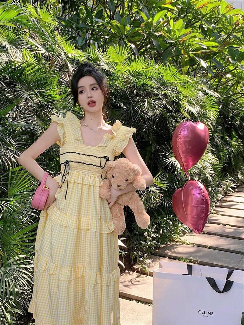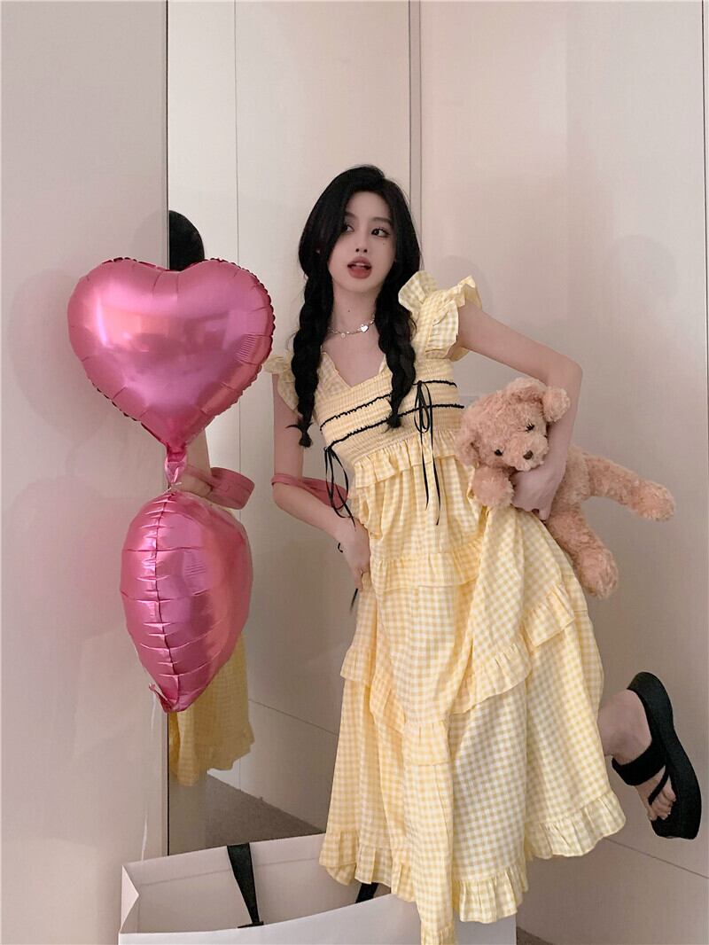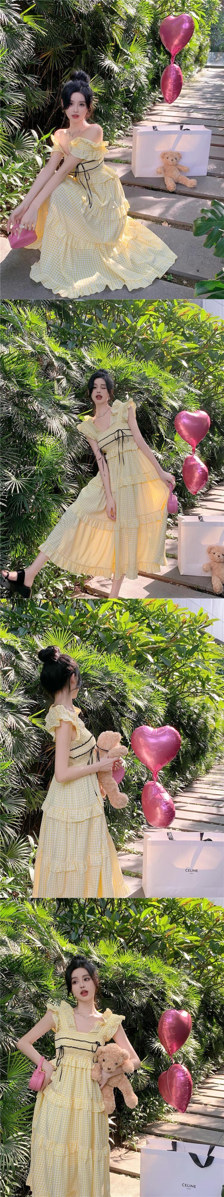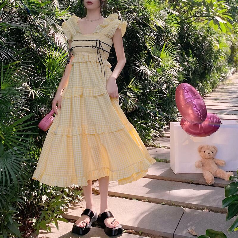 バブル格子弓サスペンダードレス女性の夏フランス穏やかな風ミッドレングスウエストスリムドレス Vestidos リボン サマー 夏物 got67793323246