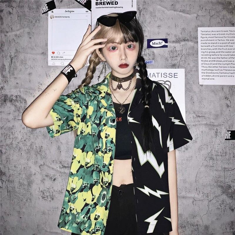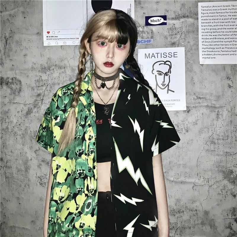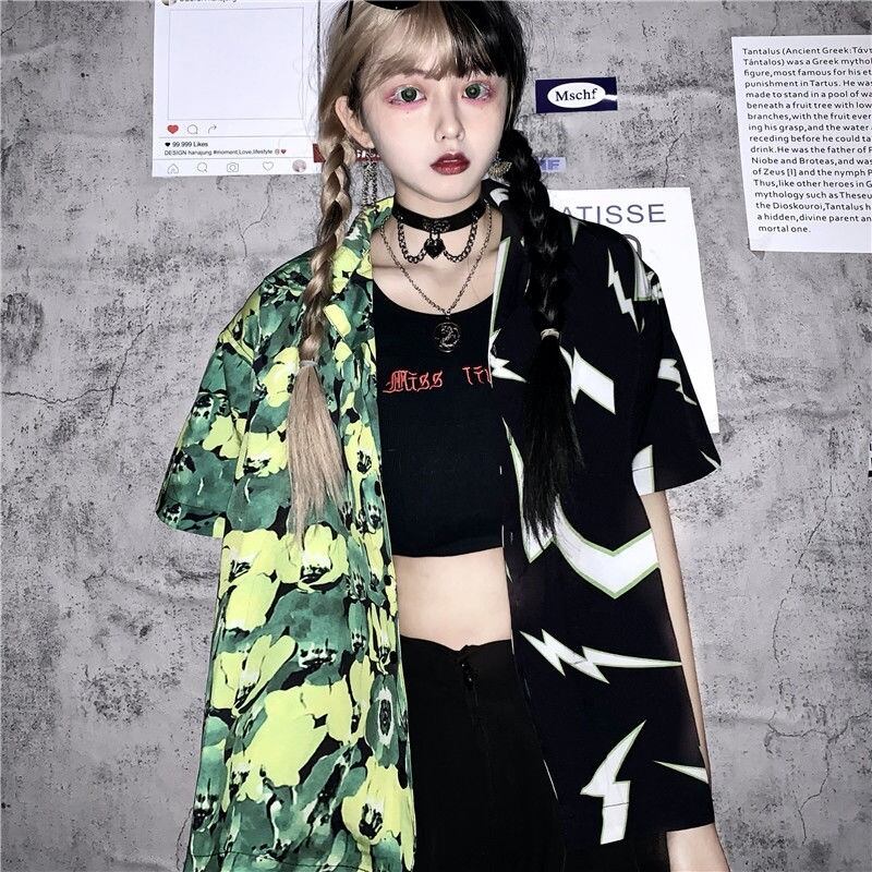 ゴシックシャツ女性ブラウス原宿雷プリントシャツ夏モンスター柄半袖ブラウスレトロパッチワークトップス ショート ハーフスリーブ かわいい サマー 夏物 got99525964763