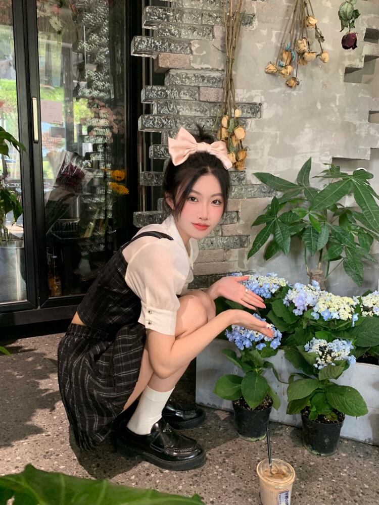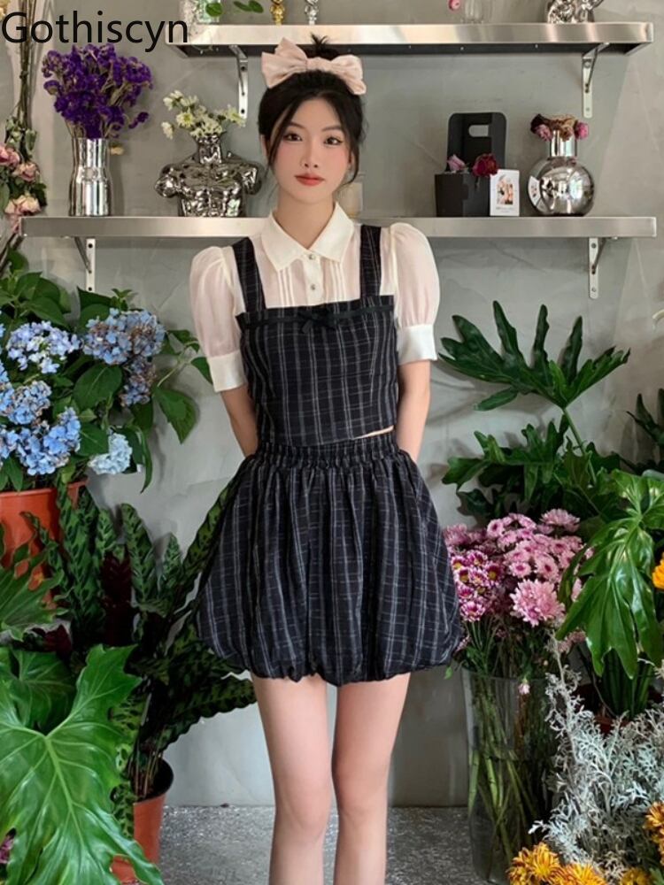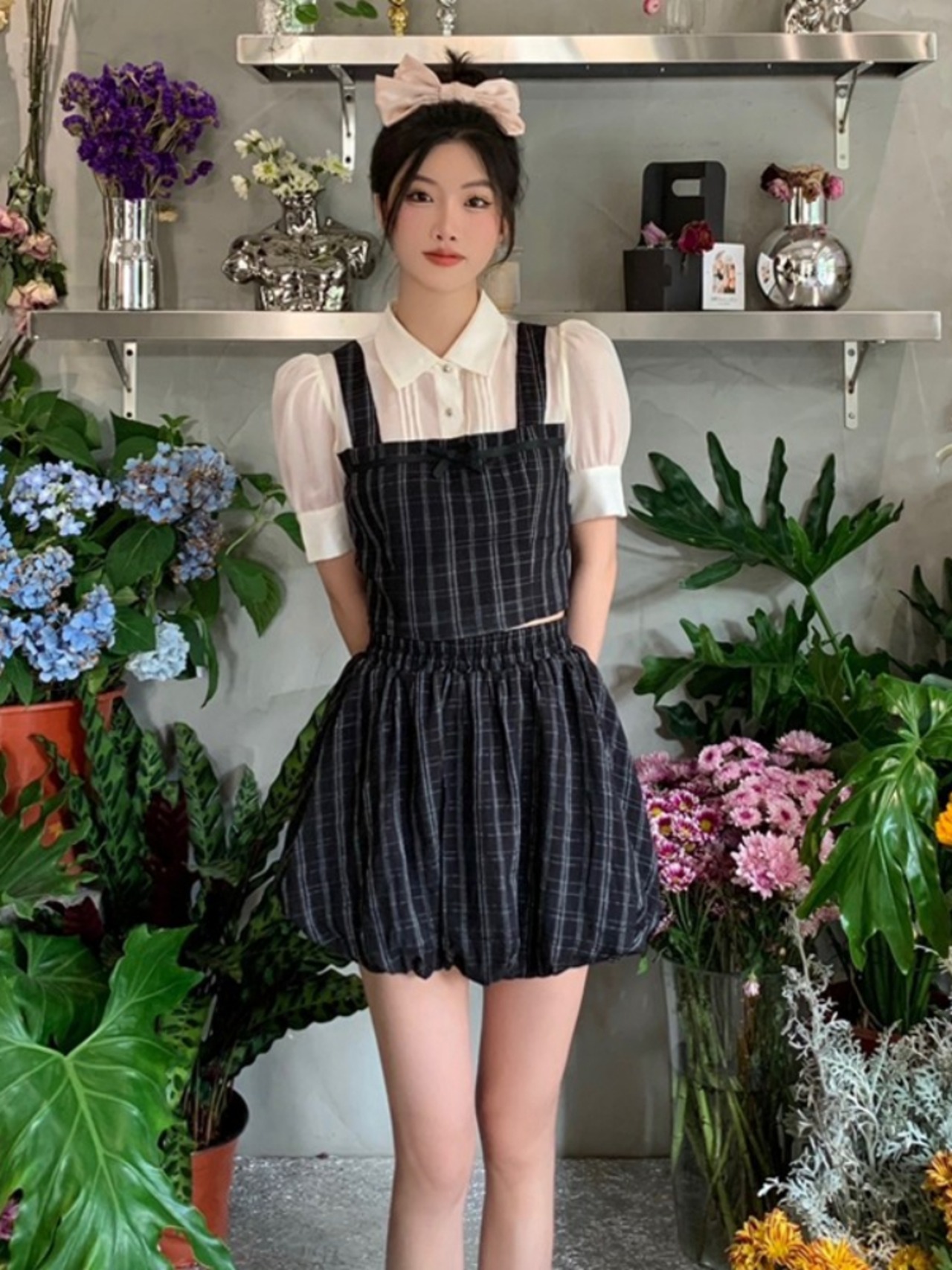夏南ツーピーススカートセットプレッピースタイルチェック柄スーツ女性パフスリーブトップ夏ふくらんスカート気質 サマー 夏物 got23757174145