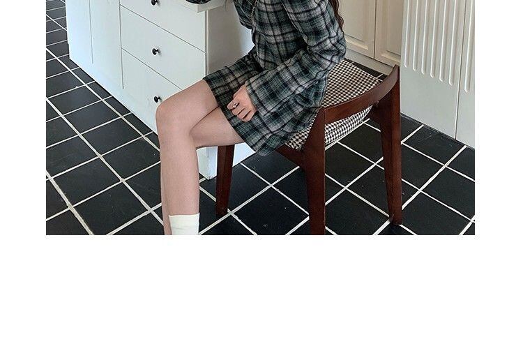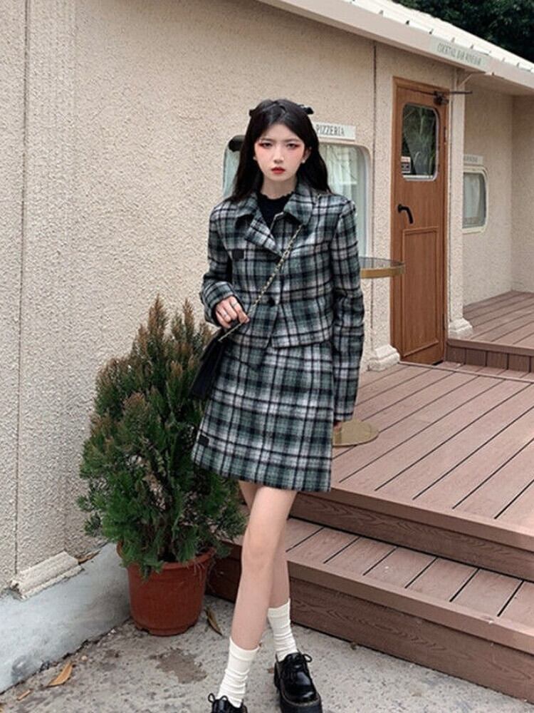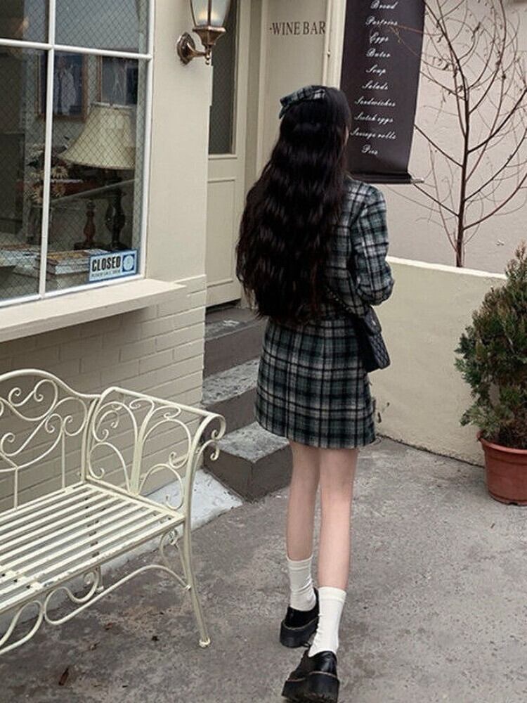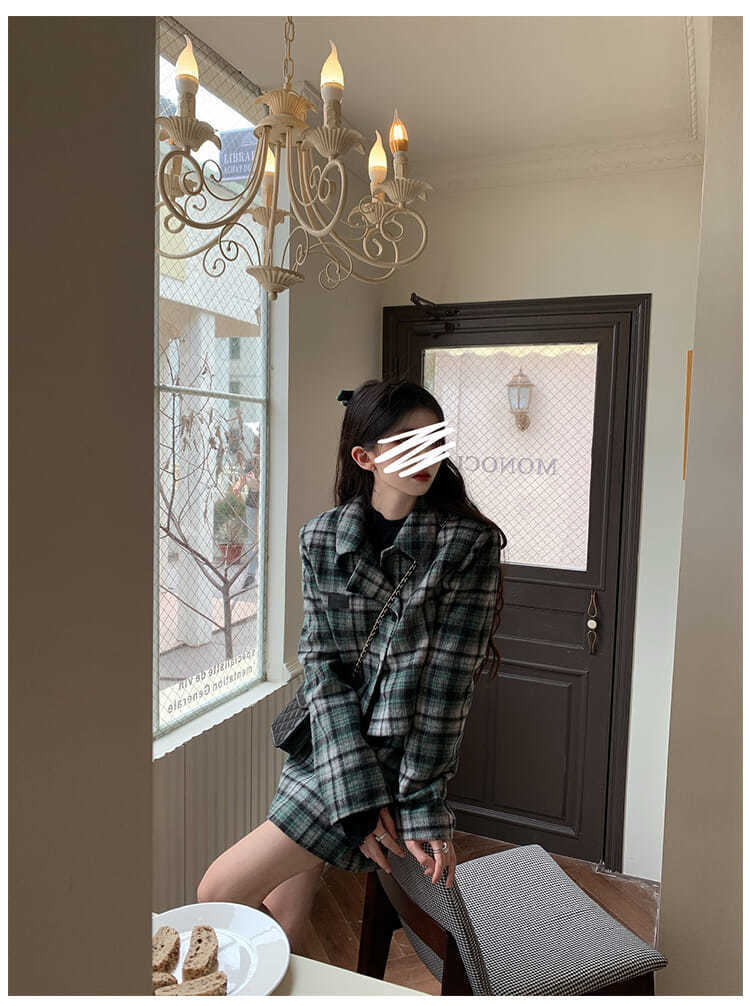 2 ピースブレザースーツミニプリーツスカート衣装秋冬女性グリーンチェック柄セットプレッピースタイル オータム 秋物 ウィンター 冬物 got493125035