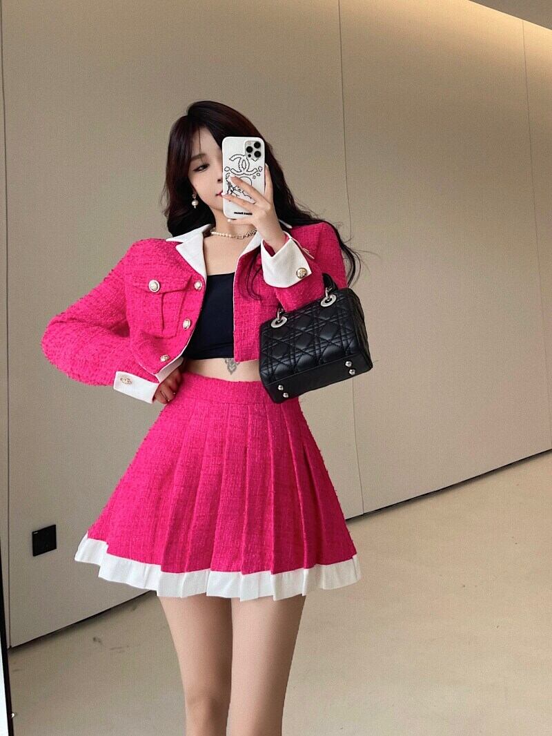 ツーピースセットレディース衣装ツイードコントラストカラースーツウエスト A 型プリーツ無地梨花服秋/冬セット オータム 秋物 ウィンター 冬物 ソリッドカラー got87027001659